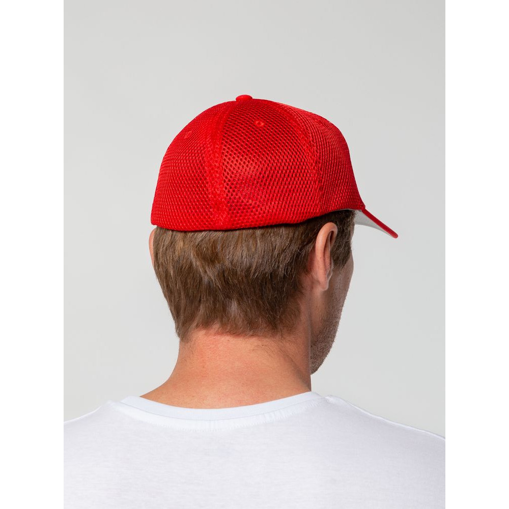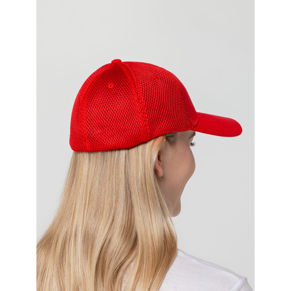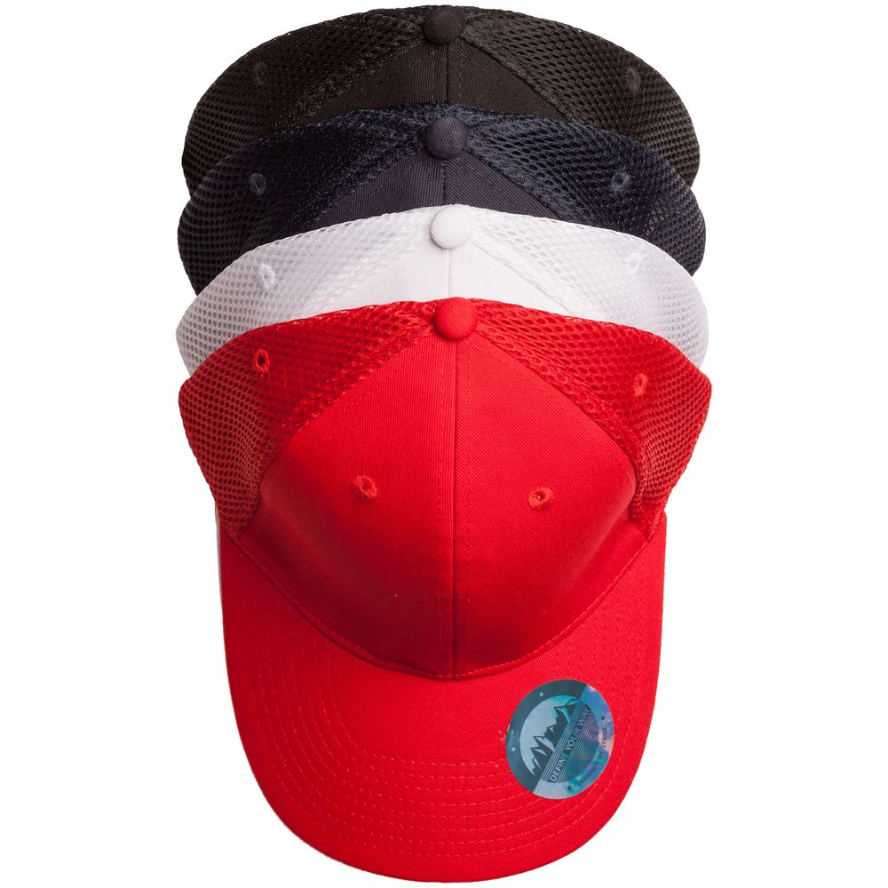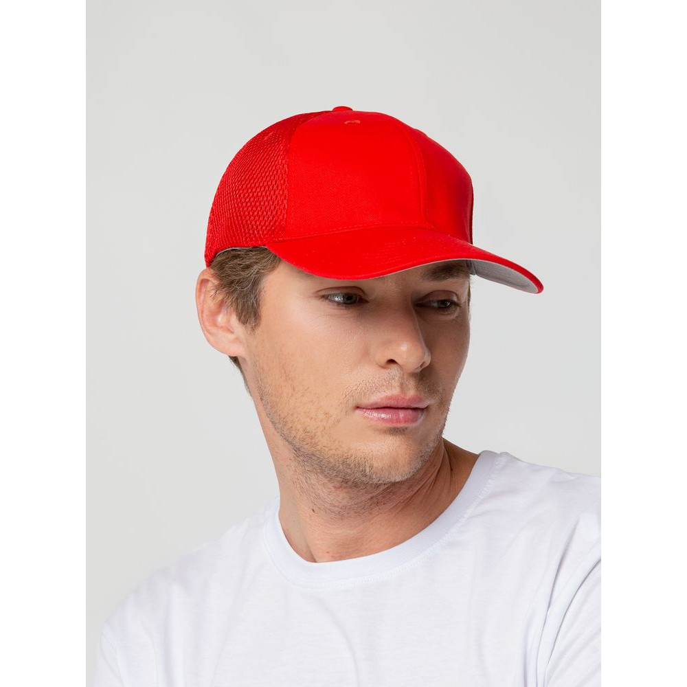 - Однотонная бейсболка из двух видов ткани: козырек и лобовые клинья из гладкого полотна, клинья на боках и на тыльной стороне из спортивной сетки
