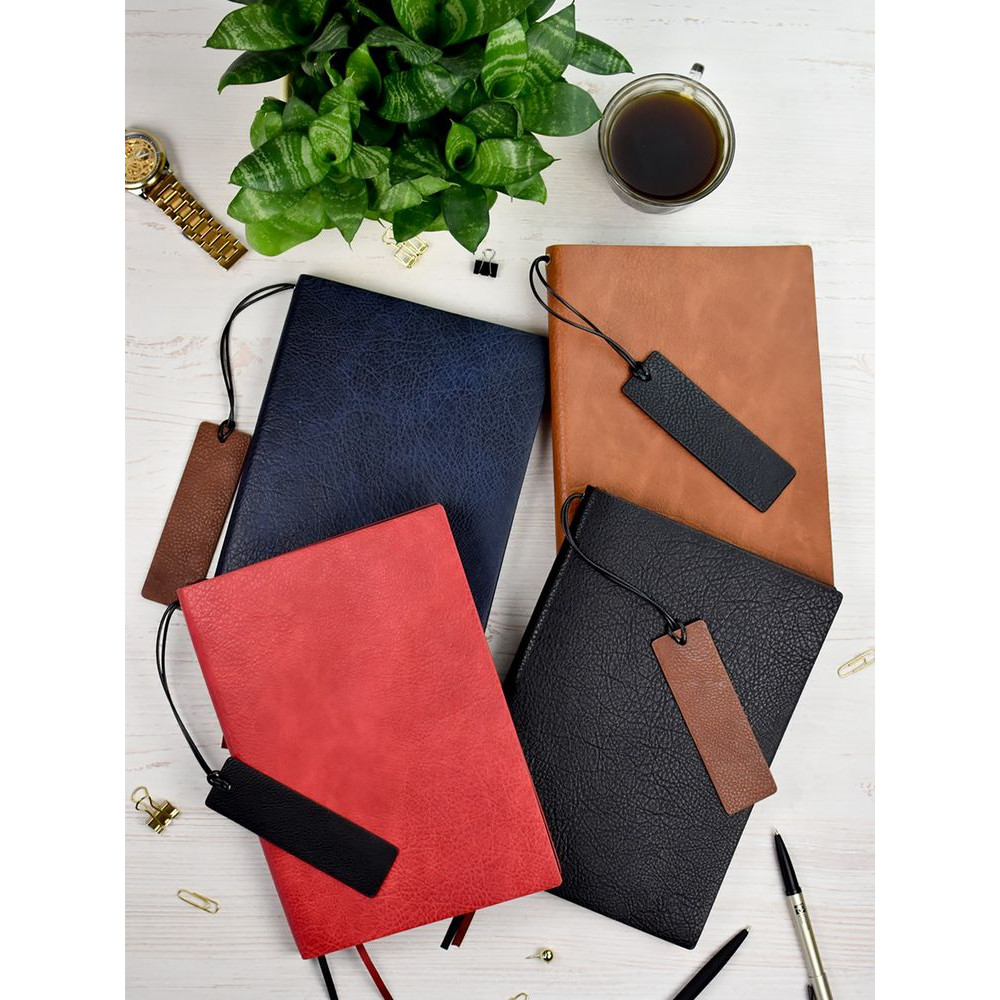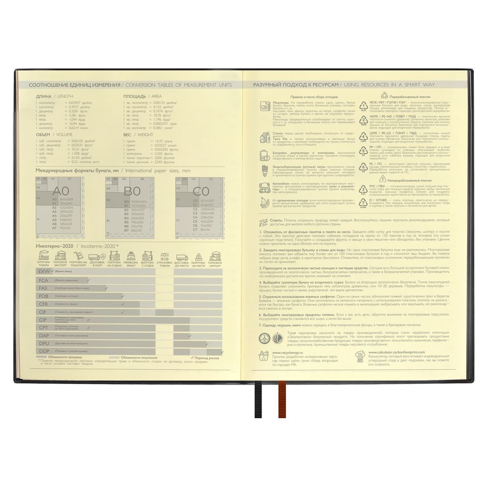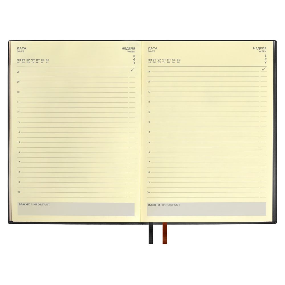 Ежедневник с гибкой обложкой и закладкой из искусственной кожи, дополнен капталом и двойным ляссе.