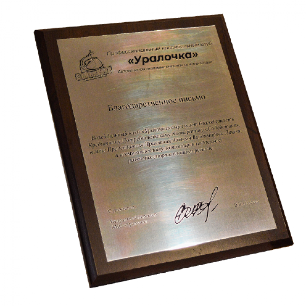 Представляет собой деревянную основу с металлической пластиной под гравировку, на которую нанесено изображение. Позволяет сочетать только черный цвет со стандартными цветами металла (золото или серебро). Плакетки с гравировкой смотрятся строго, дорого и солидно.