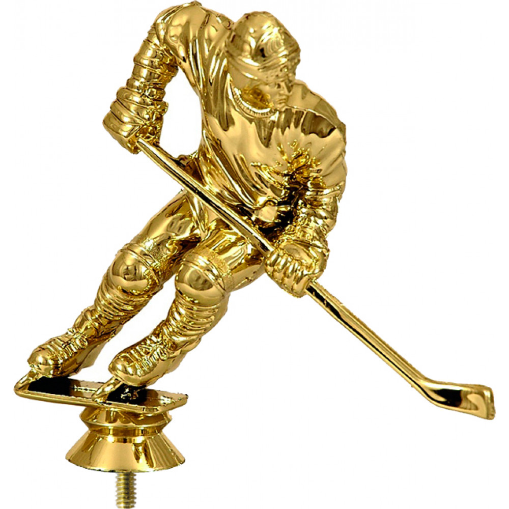 Фигурка пластиковая "Хоккей". Цвет золото. Изображает хоккеиста, ведущего по арене шайбу. Хоккеист представлен в полном обмундировании (коньки, шлем, наколенники, форма, перчатки). Ноги согнуты в коленях, хоккеист едет вперед и держит клюшку двумя руками. Клюшка находится с левой стороны от хоккеиста, голова так же повернута влево. правое плечо и локоть направлены вверх, кисть держит самый край клюшки. Контур фигуры в целом можно обвести в треугольник. Хоккеист установлен на плоской прямоугольной подставке, под подставкой находится небольшой элемент для крепления в виде возвышения. Фигурку возможно закрепить на цоколь, постамент или кубок.