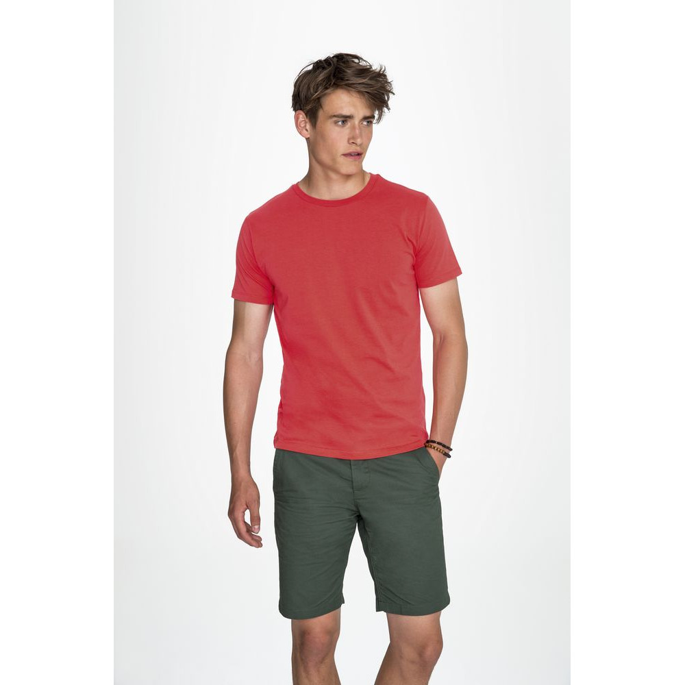 Кроеная мужская футболка с круглой горловиной. Ворот в тонкую резинку с укрепляющей тесьмой. Облегающий силуэт.