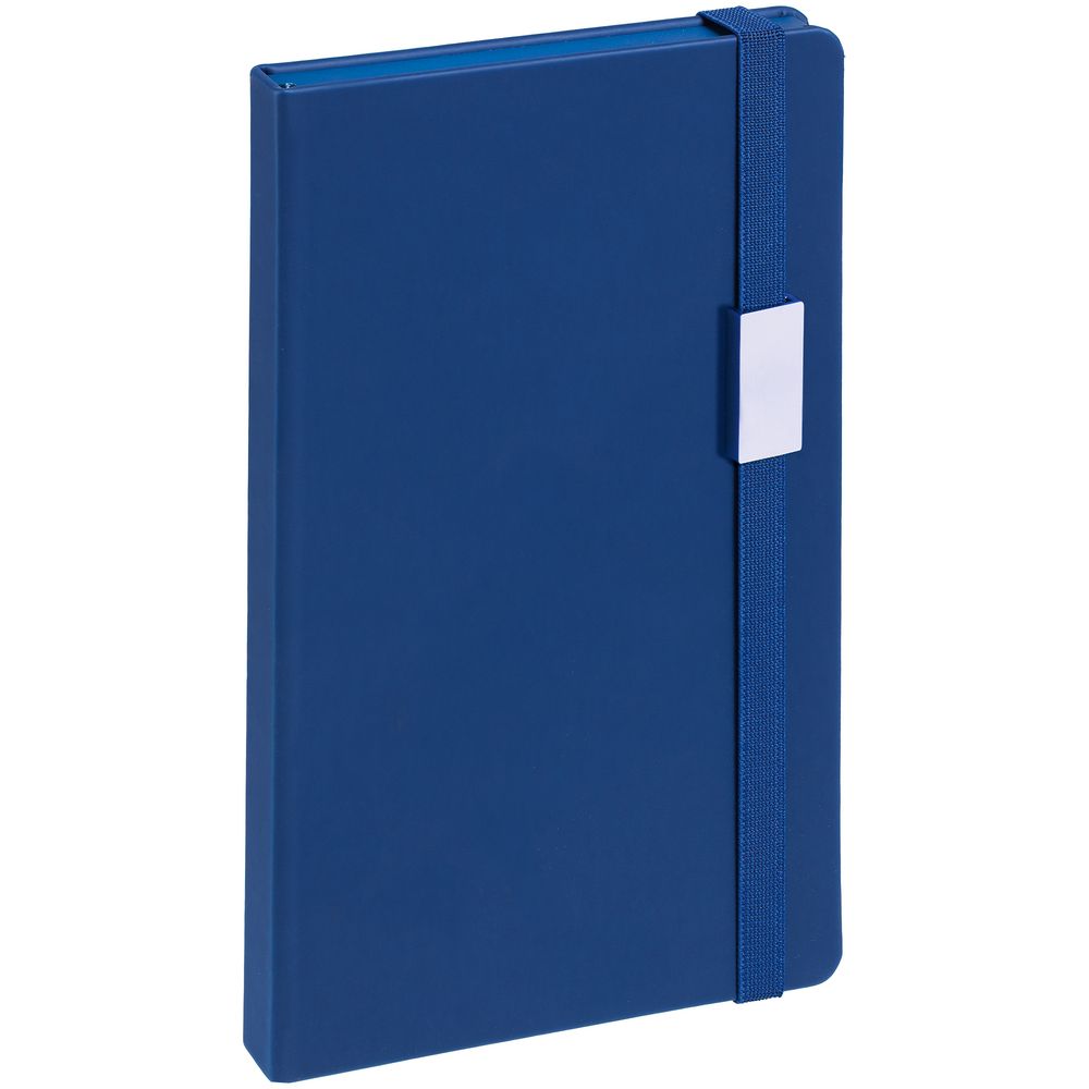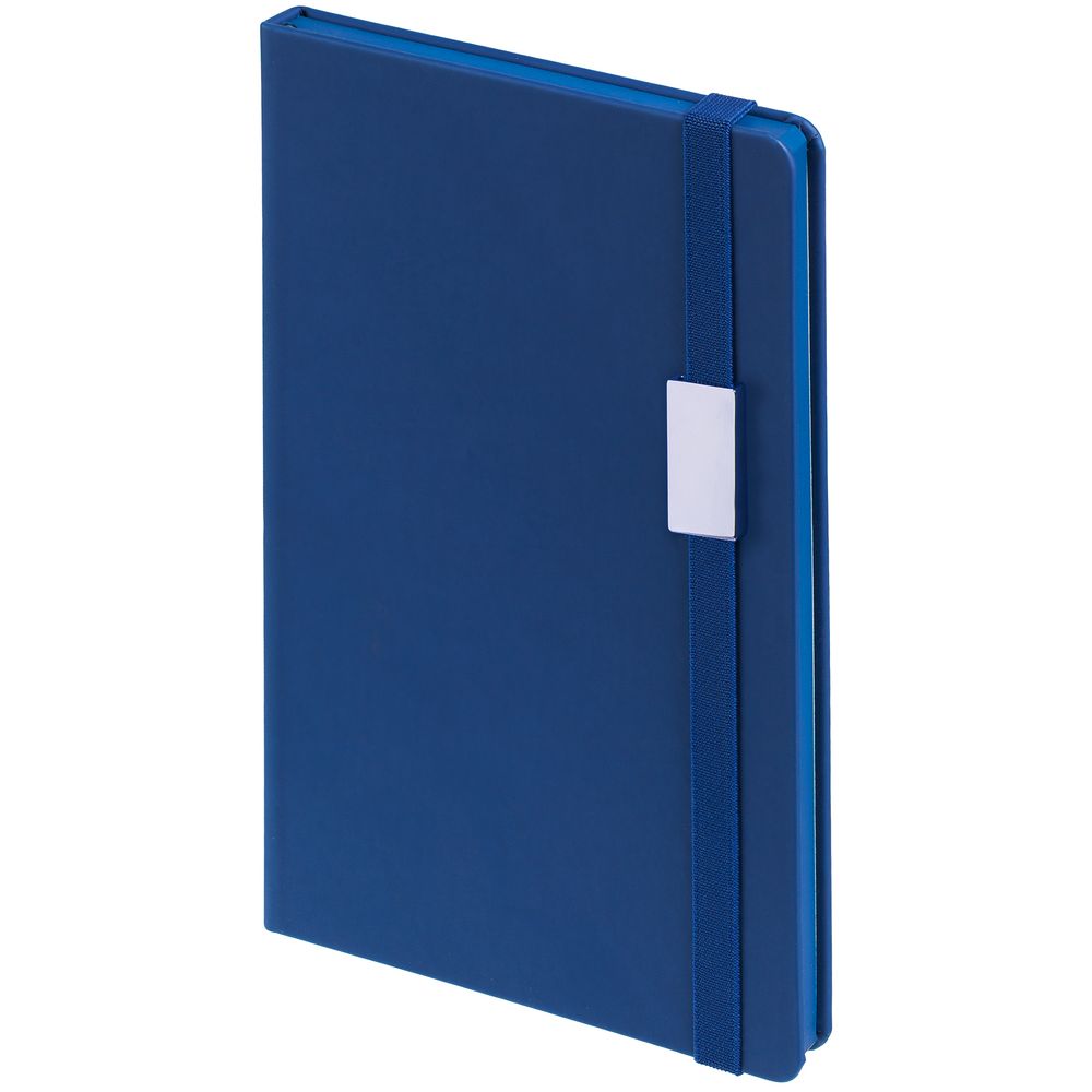 Блокнот в твердой обложке, выполнен из материала Soft Touch Pearl, синий НН, дополнен резинкой и ляссе в цвет обложки.