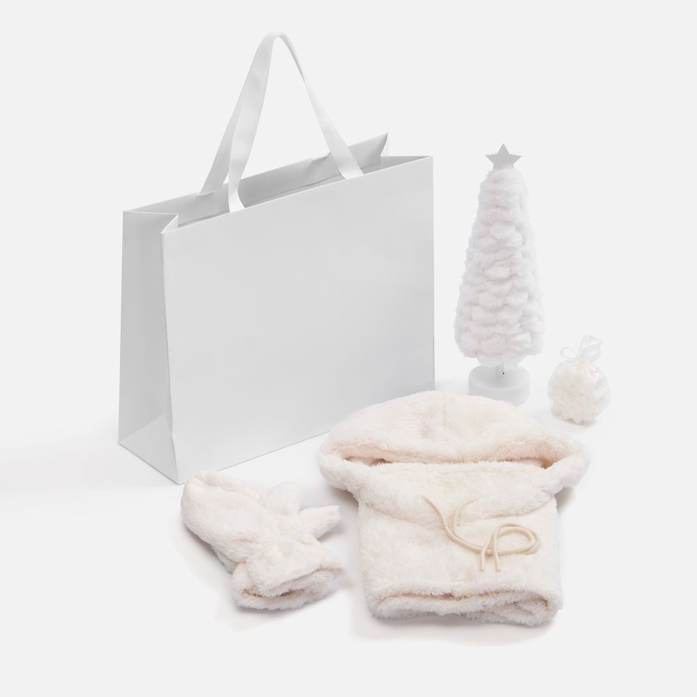 Мягкие варежки и балаклава, светильник-елочка и свеча-снежинка — нежный и «пушистый» зимний набор.