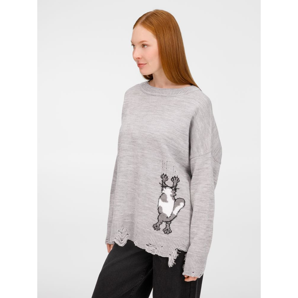 В дизайне мягкого джемпера с круглым вырезом Sharpick гранж-эстетика органично сочетается с милым акцентом — пушистым рисунком в виде озорного котика. Получается веселая вариация на тему того, откуда берется модная рваная одежда, а джемпер моментально создает настроение легкой несерьезности. Рваные края изделия добавляют современную нотку, а резинка на вороте, манжетах и по низу обеспечивает удобную посадку.