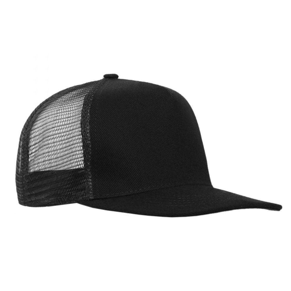 Бейсболка-пятиклинка с прямым жестким козырьком и пластиковой регулируемой застежкой, боковые клинья выполнены из жесткой сетки.