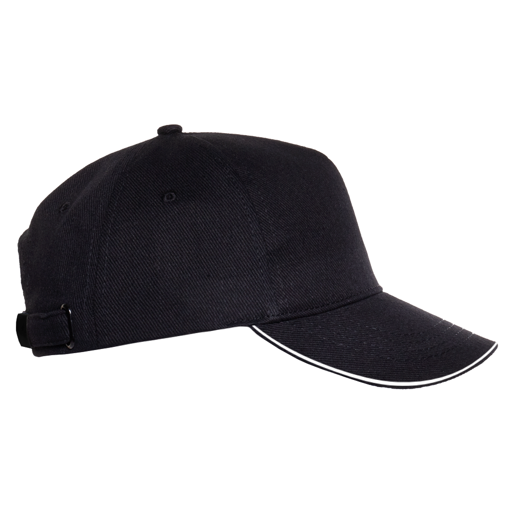 Пятиклиновый пошив, отсутствие лобового шва и изогнутый жесткий козырек «сэндвич» с контрастным кантом. Посадка регулируется ремешком с металлической застежкой.