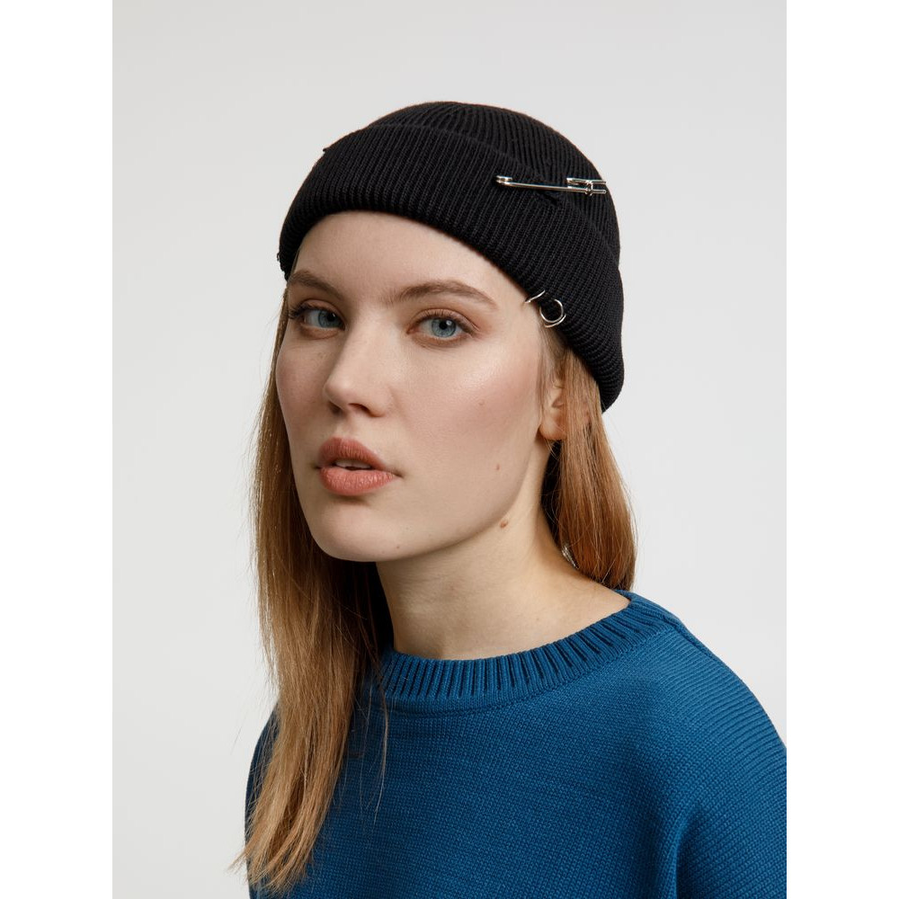 Однослойная шапка бини с рваным отворотом и металлическими аксессуарами для дерзких образов в любом возрасте. Яркий и запоминающийся акцент в стиле гранж.