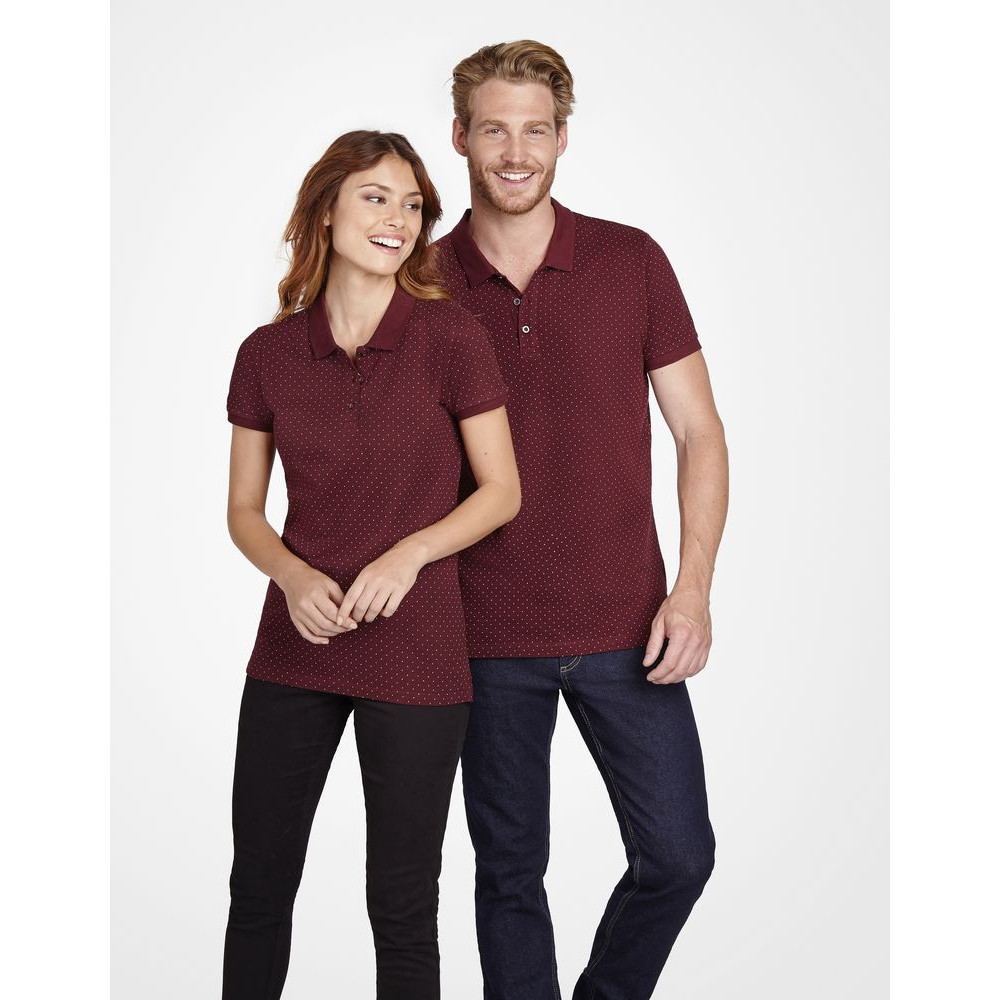 Рубашка поло приталенного силуэта с рисунком в точку. Лейбл производителя в боковом шве изнутри, в шве горловины - только бирка с размером, что позволяет вам нанести свой логотип.