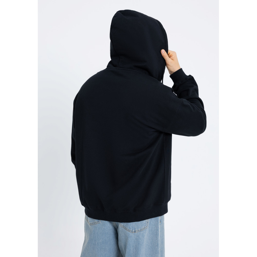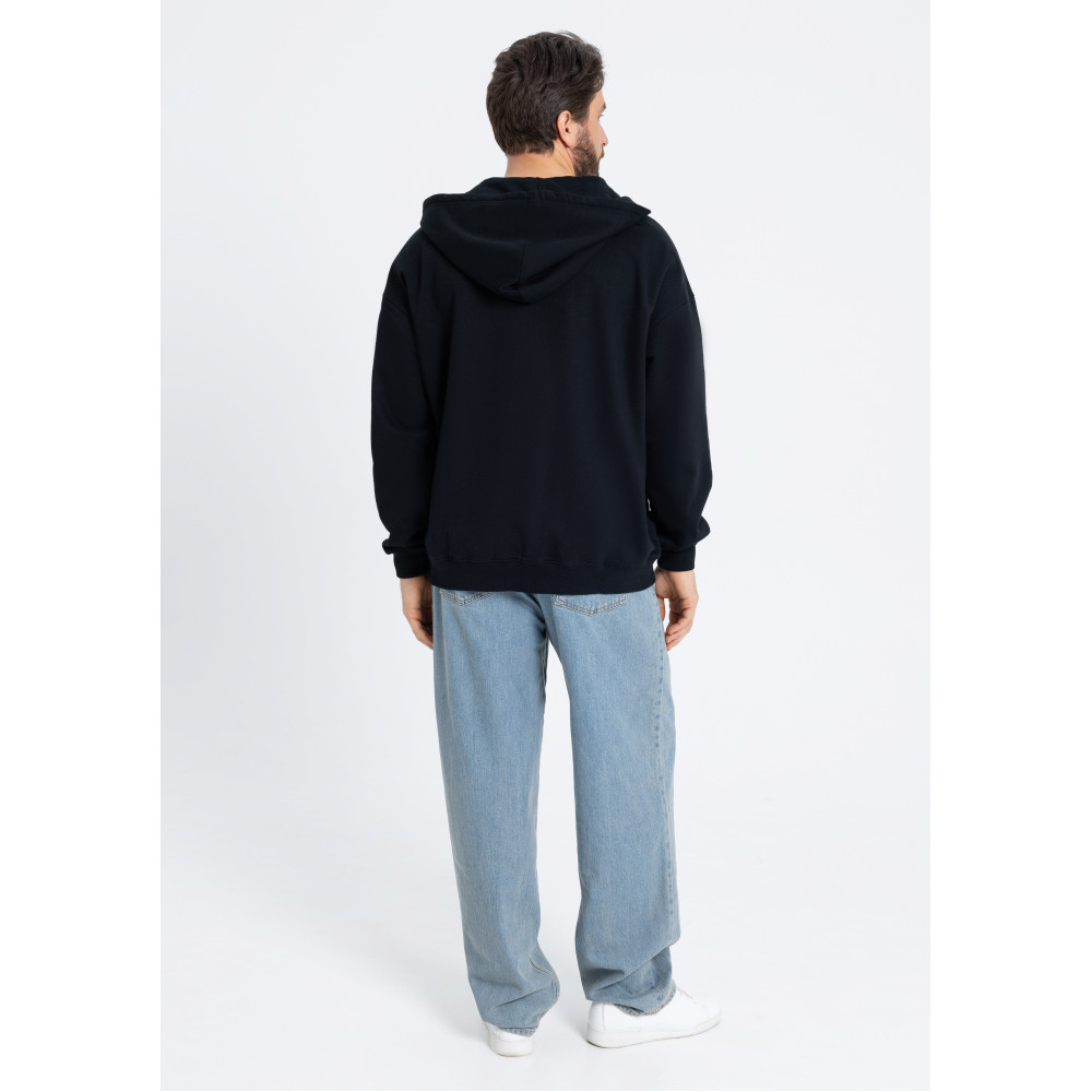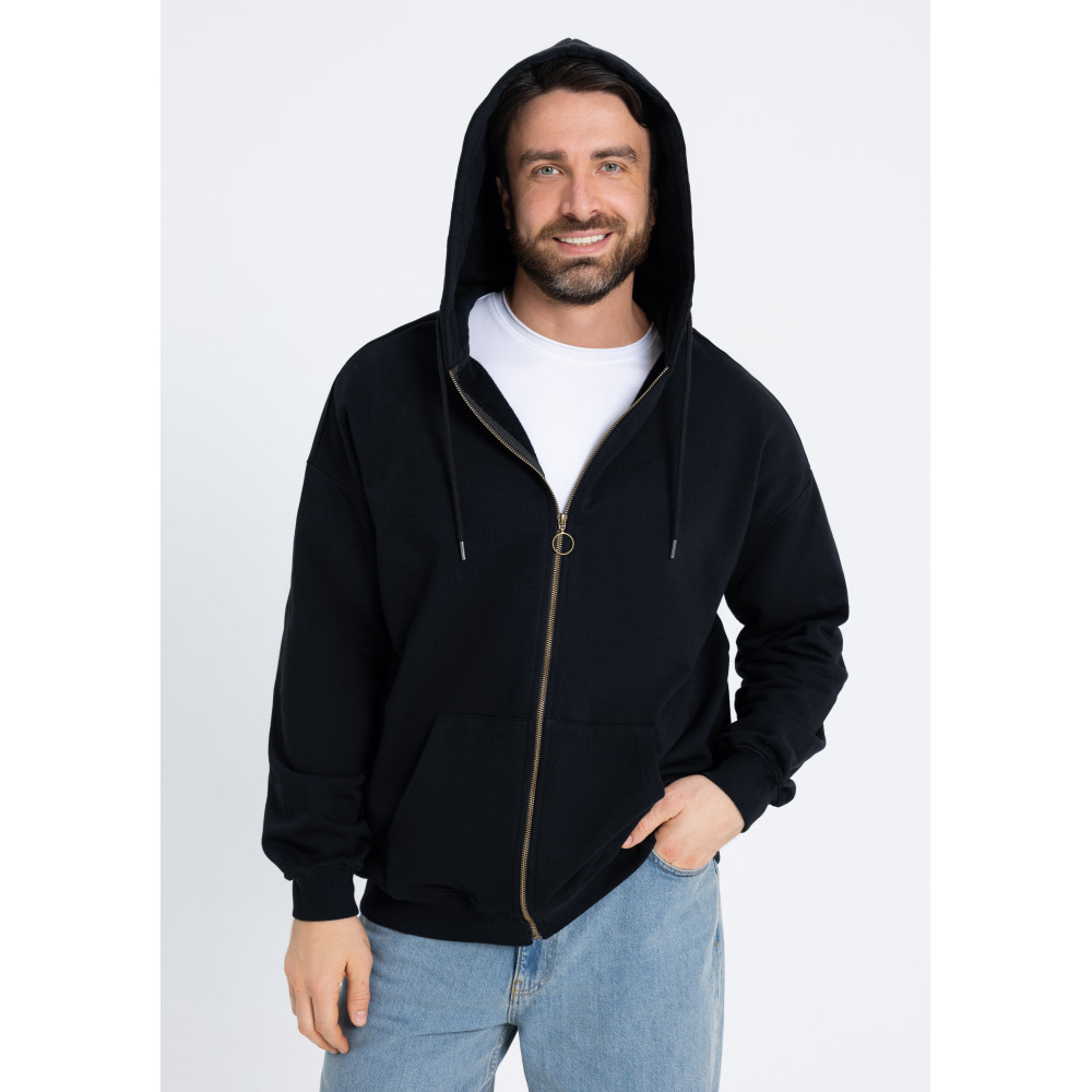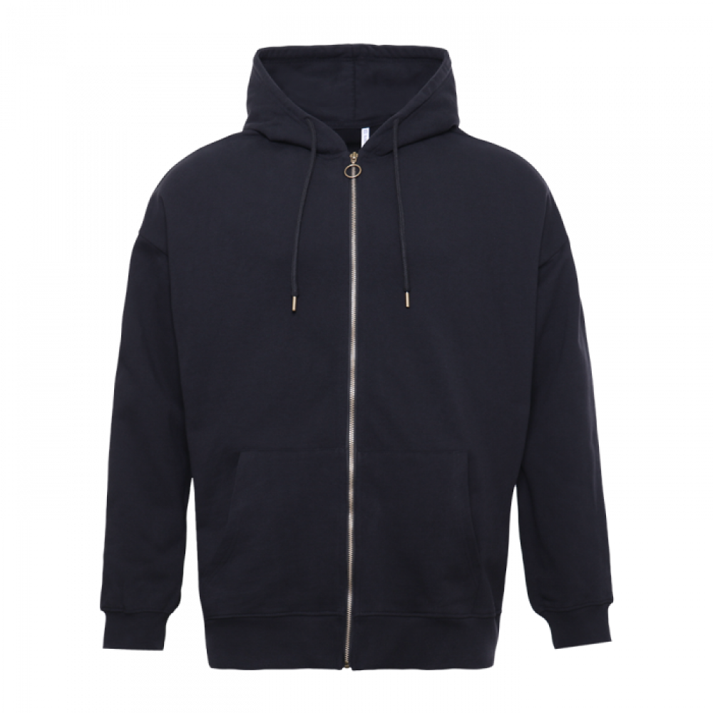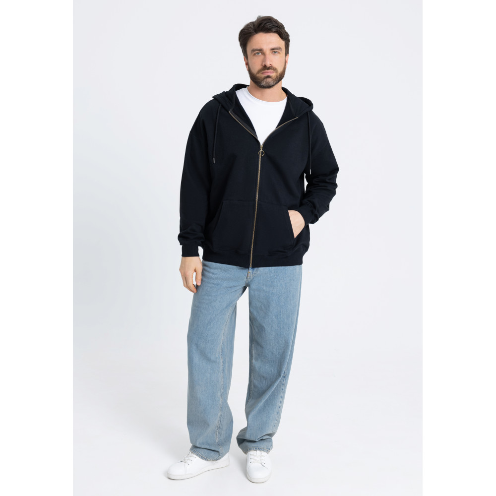 Толстовка силуэта oversize с капюшоном комфортной глубины, спущенной линией плеча и глубоким карманом. Крой дополнен акцентной молнией, а горловина и спинка модели укреплены киперной тесьмой.