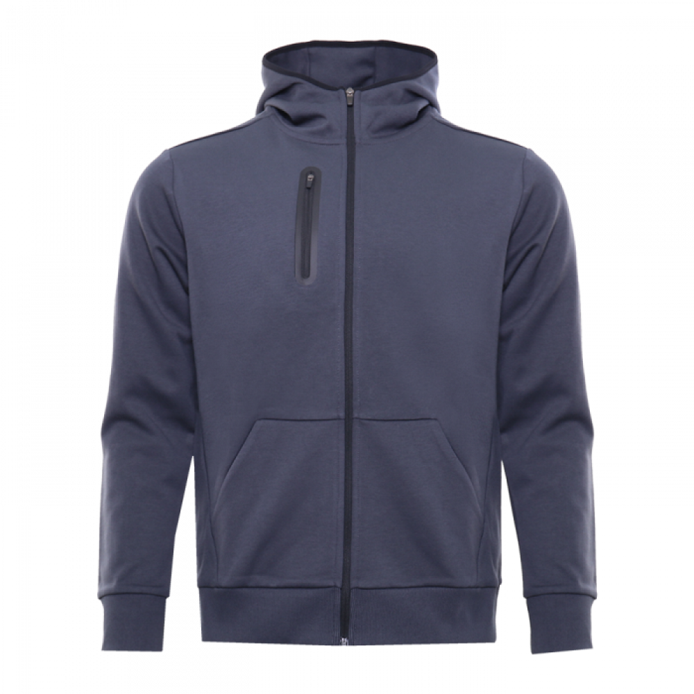 Толстовка прямого силуэта с капюшоном, переходящим в воротник-стойку, глубокими накладными карманами, прорезным нагрудным карманом и застежкой на молнию. Модель дополнена плотными манжетами на рукавах и по низу изделия, что повышает её практичность и защищает от проникновения холода.