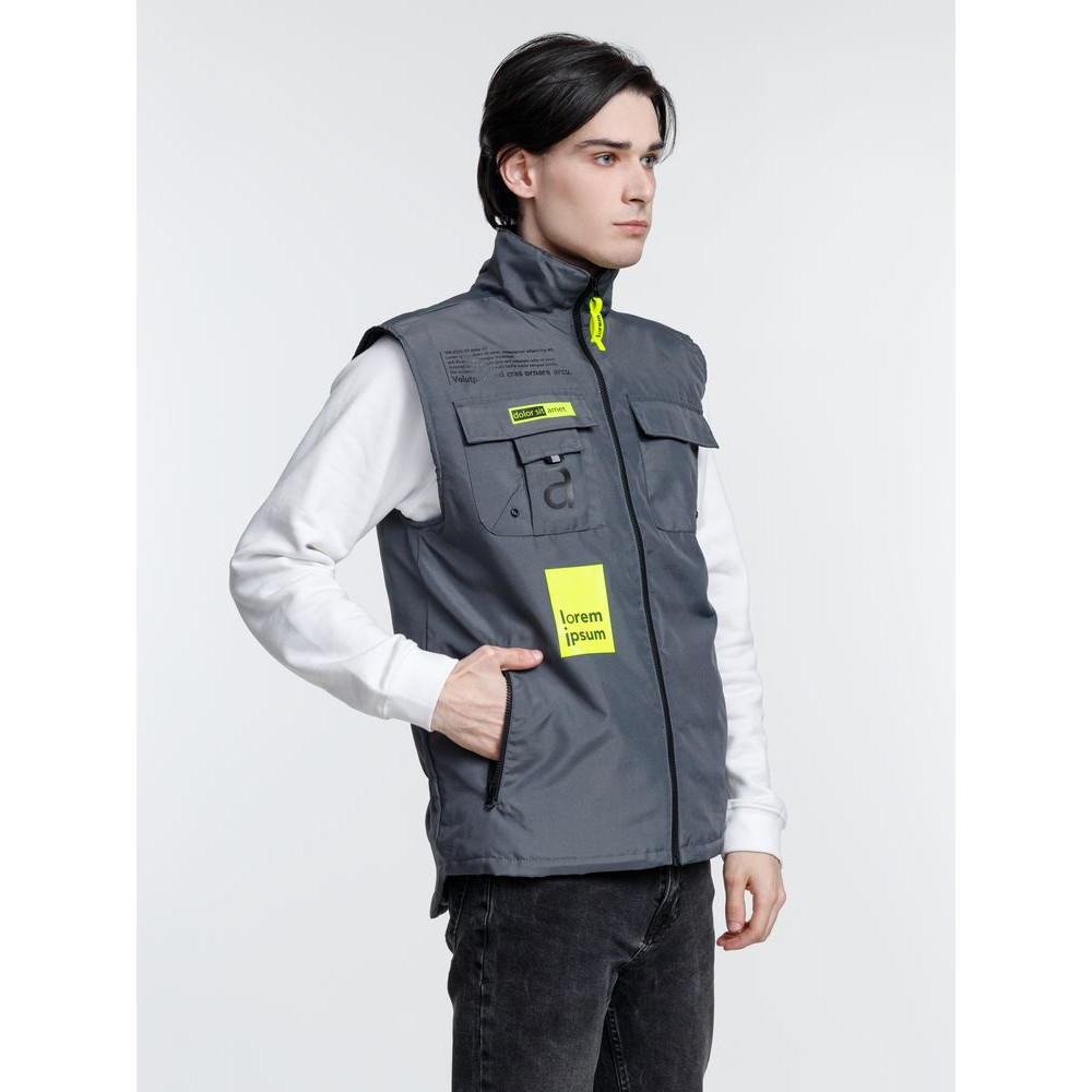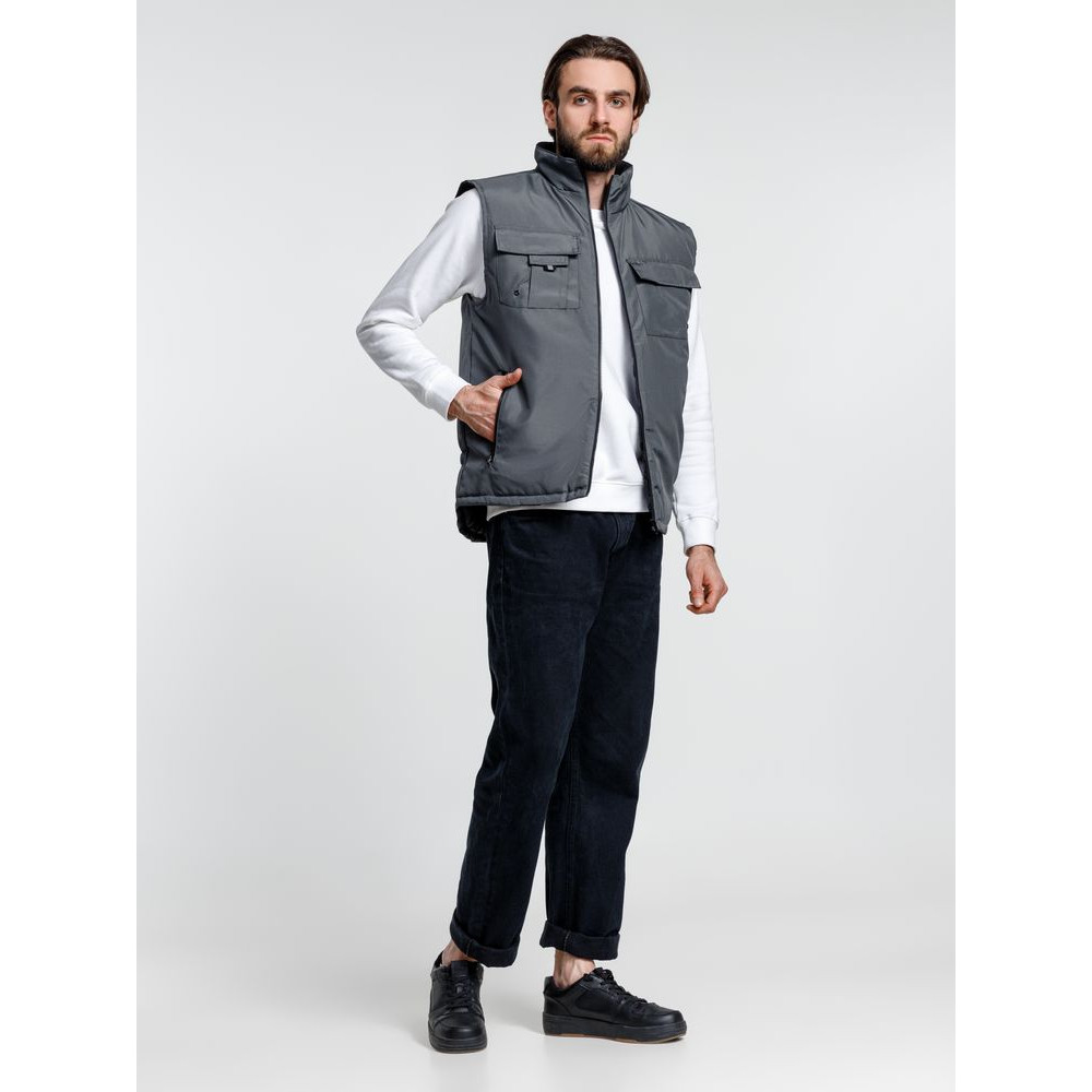 Мужской утепленный жилет с воротником-стойкой и удлиненной спинкой. Выполнен из ткани оксфорд с водоотталкивающим покрытием.