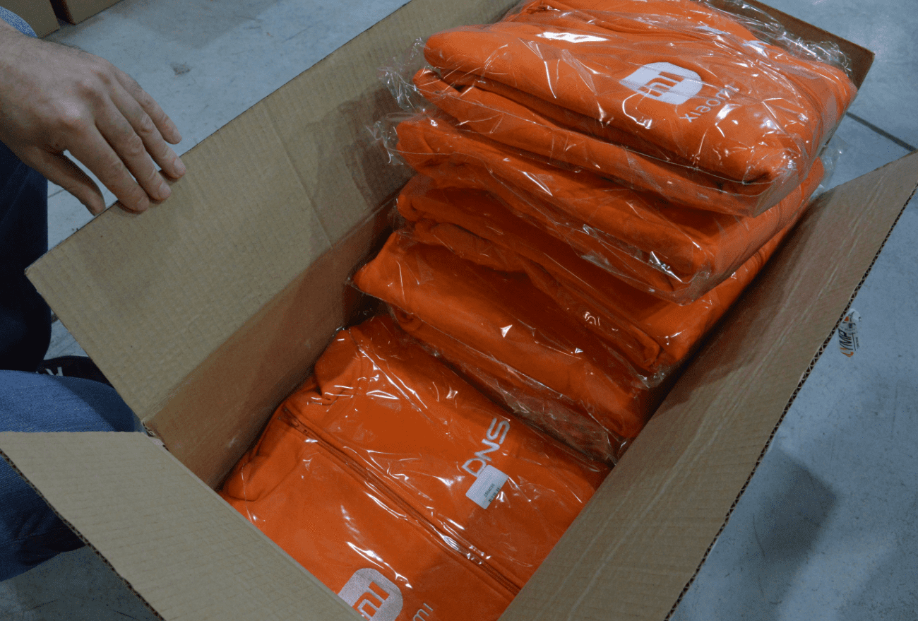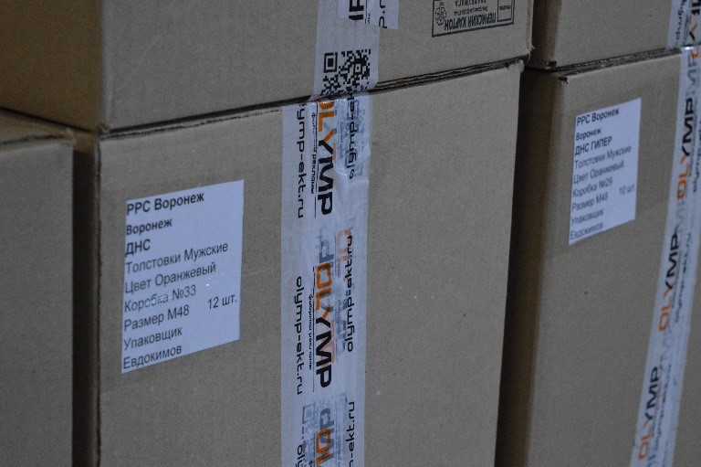 3.2. В качестве тары использованы короба из пятислойного гофрированного картона. Короба заклеены фирменным скотчем. На гофротару нанесена упаковочная маркировка в виде стикера со следующей информацией: наименование Заказчика, тип изделия, цвет, размерная сетка с количеством штук каждого размера, номер короба в партии, фамилия упаковщика.