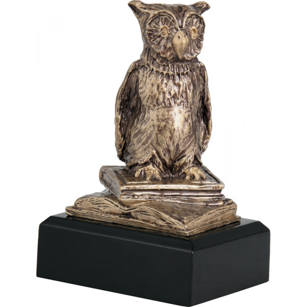 Фигурка литая "Образование". Цвет бронза. Материал: пластик. Высота 13,5 см. Изображена сова, сидящая на книгах. Верхняя книга закрыта, нижняя книга открыта. Фигурка установлена на цоколе в форме прямоугольника, цвет черный.