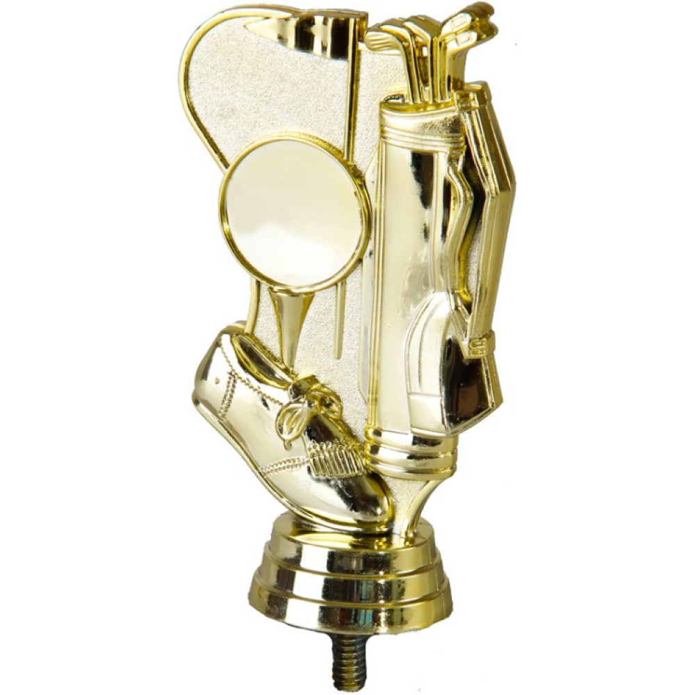 Цвет: золото, материал: пластик. Вид спорта: гольф. Фигурка выполнена в виде основания с выпуклыми и закруглёнными краями, с объемной окантовкой. Основание покрыто шагренью, на нём имеются объёмные декоративные элементы. В левой нижней части имеется элемент в виде кроссовка для игры в гольф, вверх от него отходит подставка для мяча, а вместо мяча – место для нанесения персонализации. Справа- флажок, обозначающий лунку. У правого края расположена сумка, наполненная клюшками для игры в гольф. Фигурка выполнена в золотом цвете, что придаёт ей роскоши и уникальности. Ниже - круглое основание, на котором имеются горизонтальные линии. Высота, см: 11.1 Вес, кг: 0.045. Фигурку возможно закрепить на цоколь, постамент или кубок.