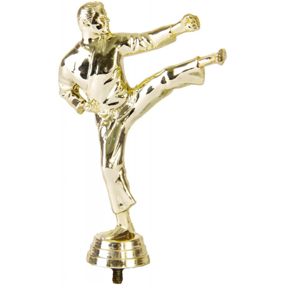 Цвет: золото, материал: пластик. Вид спорта: каратэ. Фигурка выполнена в виде фигуры мужчины-каратиста. Он наносит удар невидимому противнику. Его левая рука со сжатым кулаком выставлена вперёд, а правая прижата к телу. Каратист удерживает равновесие на одной ноге. Его левая нога согнута в колене для лучшей устойчивости. В нижней части фигуры - круглое основание, на котором имеются горизонтальные линии. Высота, см: 15.2. Фигурку возможно закрепить на цоколь, постамент или кубок.