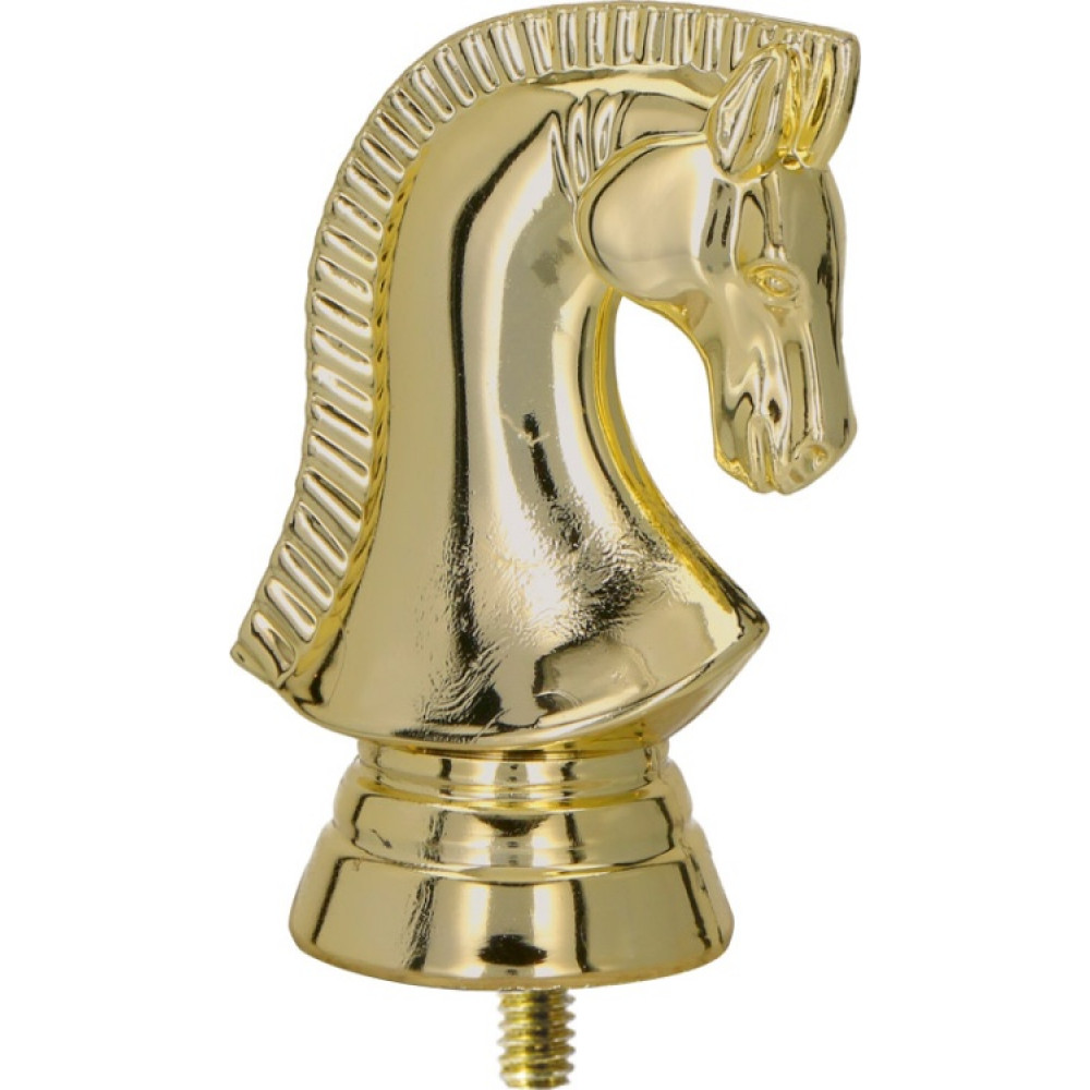 Фигурка пластиковая "Шахматы". Цвет золото. Высота 7 см. Изображена шахматная фигура "Конь": голова коня, немного наклоненная вниз, взгляд опущен вниз.¶Фигурка установлена на стеме в виде небольшого элемента конусообразной формы. ¶Фигурку возможно закрепить на цоколь, постамент или кубок.