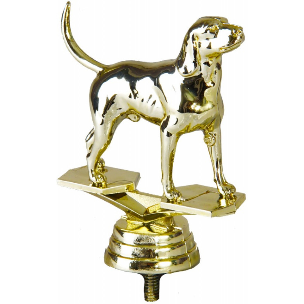 Цвет: золото, материал: пластик. Тема: собаки. Фигурка выполнена в виде собаки, будто ожидающей приказа. Её хвост поднят вверх, кажется, что ещё секунду и собака начнёт вилять. Она приподняла голову, вслушиваясь в слова хозяина, длинные уши опущены вниз. Собака стоит на двух пластинах, соединенных вместе. Ниже - круглое основание, на котором имеются горизонтальные линии. Высота, см: 10.2. Фигурку возможно закрепить на цоколь, постамент или кубок.