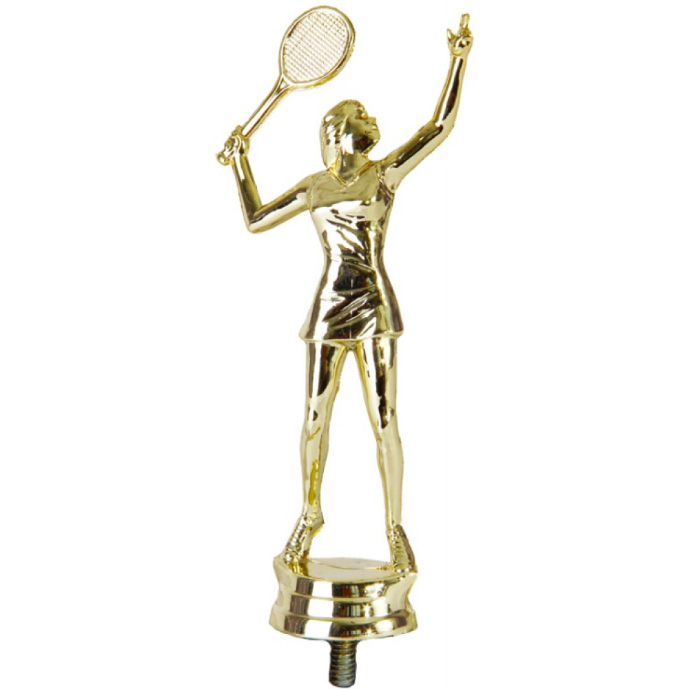 Цвет: золото, материал: пластик. Вид спорта: большой теннис. Фигурка выполнена в виде женщины- теннисистки. Ее взгляд направлен вверх на руку, в одной его руке зажата ракетка, другая- поднята вверх. Теннисистка одета в футболку и короткую юбку. Женщина вытянулась и прогнулась в спине, от чего на футболке появились складки, юбка немного приподнялась вверх из-за движения. На ногах- кроссовки. Высота, см: 14. Фигурку можно закрепить на цоколь, постамент или кубок.