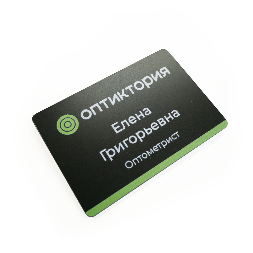 Материал - однослойный пластик белого или черного цвета, толщиной 0,8 – 1,6 мм. Это наиболее практичный для бейджа материал, стойкий к загрязнению, царапинам и воде.