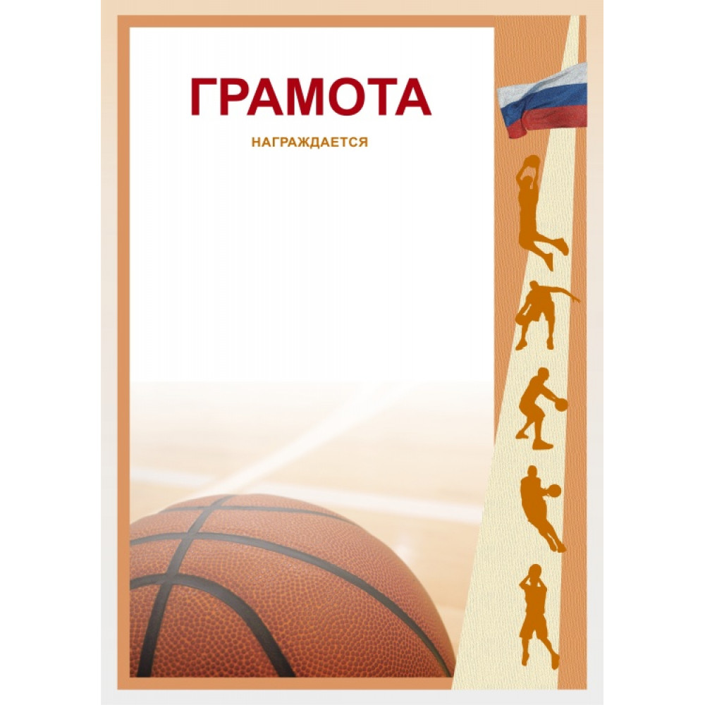 Грамота, формат А4. Бумага матовая, толщина 200 гр, полноцветная печать. ¶Фон грамоты переходящий от белого в светло-оранжевый сверху вниз. В левом нижнем углу изображен баскетбольный мяч. В верхней части по центру написано слово "Грамота" красным цветом, под ним написано "награждается" оранжевым цветом. С правой стороны грамоты расположена полоса бежевого цвета, расширяющаяся сверху вниз, и полоса оранжевого цвета, расширяющаяся снизу вверх. На бежевой полосе оранжевым цветом изображены силуэты баскетболистов в количестве 5 штук, в верхнем правом углу изображен российский флаг, извивающийся на ветру. Грамота имеет окантовку оранжевого и светло-оранжевого цветов.¶