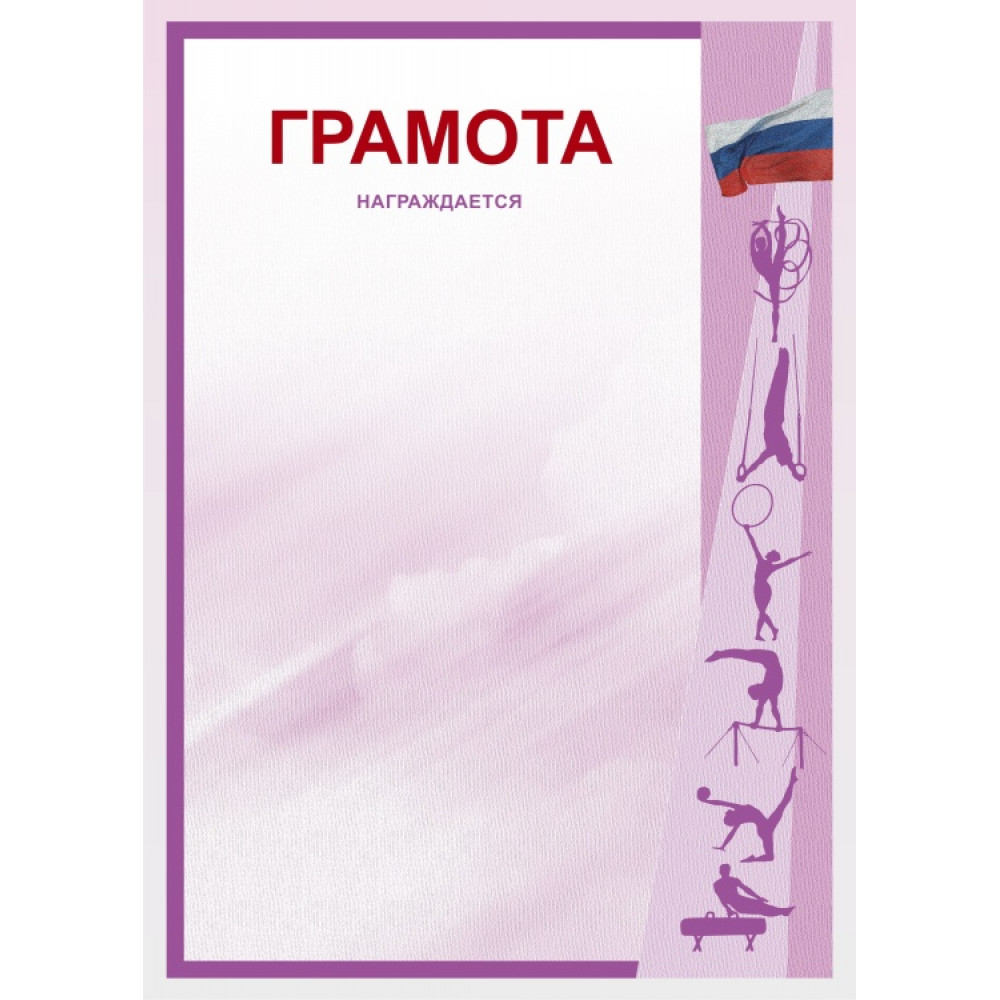 Грамота, формат А4. Бумага матовая, толщина 200 гр, полноцветная печать. ¶Фон грамоты белый с розовым. В верхней части по центру написано слово "Грамота" красным цветом, под ним написано "награждается" розовым цветом. С правой стороны диплома расположена полоса светло-розового цвета, расширяющаяся сверху вниз, и полоса ярко-розового цвета, расширяющаяся снизу вверх. На бежевой полосе розовым цветом изображены силуэты гимнастов в количестве 6 штук, в верхнем правом углу изображен российский флаг, извивающийся на ветру. Диплом имеет окантовку ярко-розового и светло-розового цветов.¶