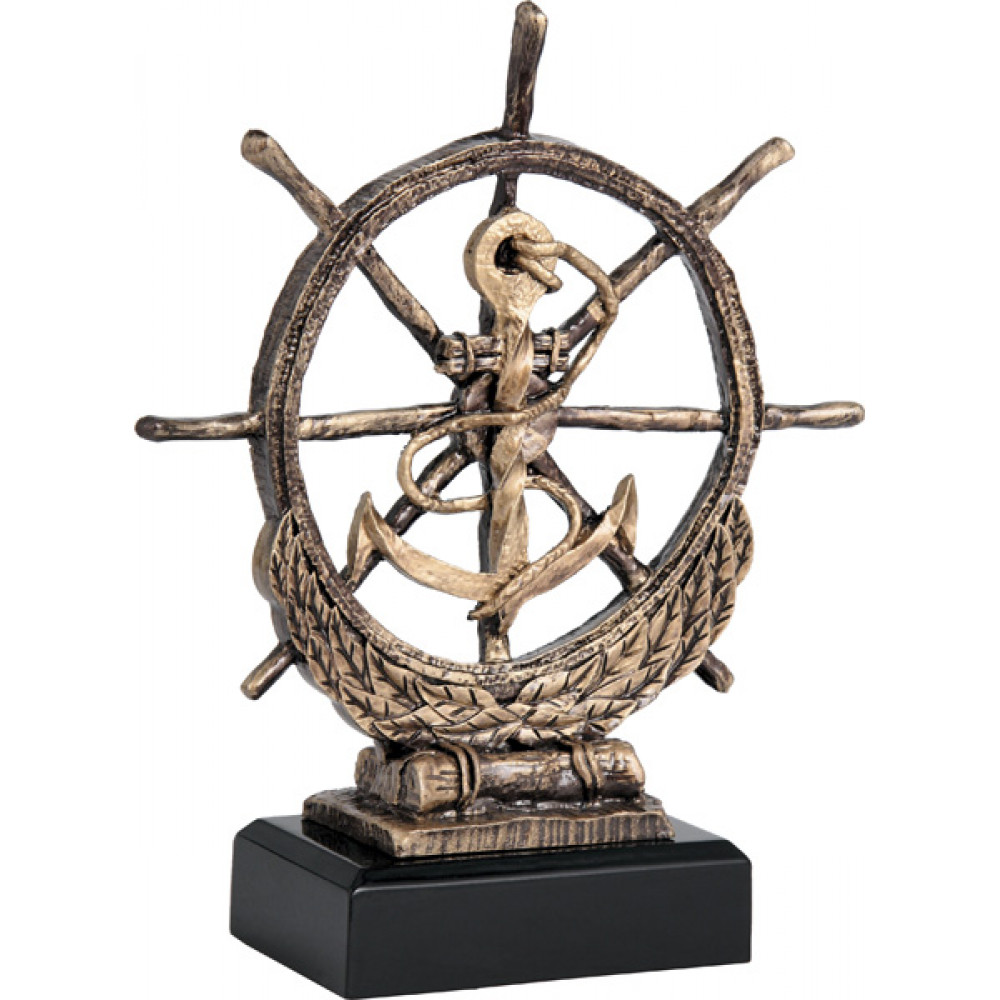 Фигурка литая "Парусный спорт". Цвет бронза. Материал: пластик. Высота 23,5 см. Изображен руль корабля, в центре которого находится якорь. Нижнюю часть руля огибают лавровые ветви. Фигурка установлена на цоколе в форме прямоугольника, цвет черный.