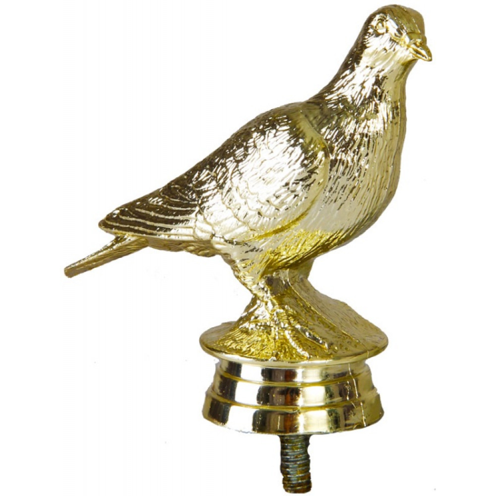 Цвет: золото, материал: пластик. Тема: голубь. Фигурка выполнена в виде птицы - голубя. Его крылья прижаты к телу, голова повернута в бок, словно голубь прислушивается к чему-то. Золотые перья сверкают на солнце. Ниже - круглое основание, на котором имеются горизонтальные линии Высота, см: 7.6. Фигурку возможно закрепить на цоколь, постамент или кубок.