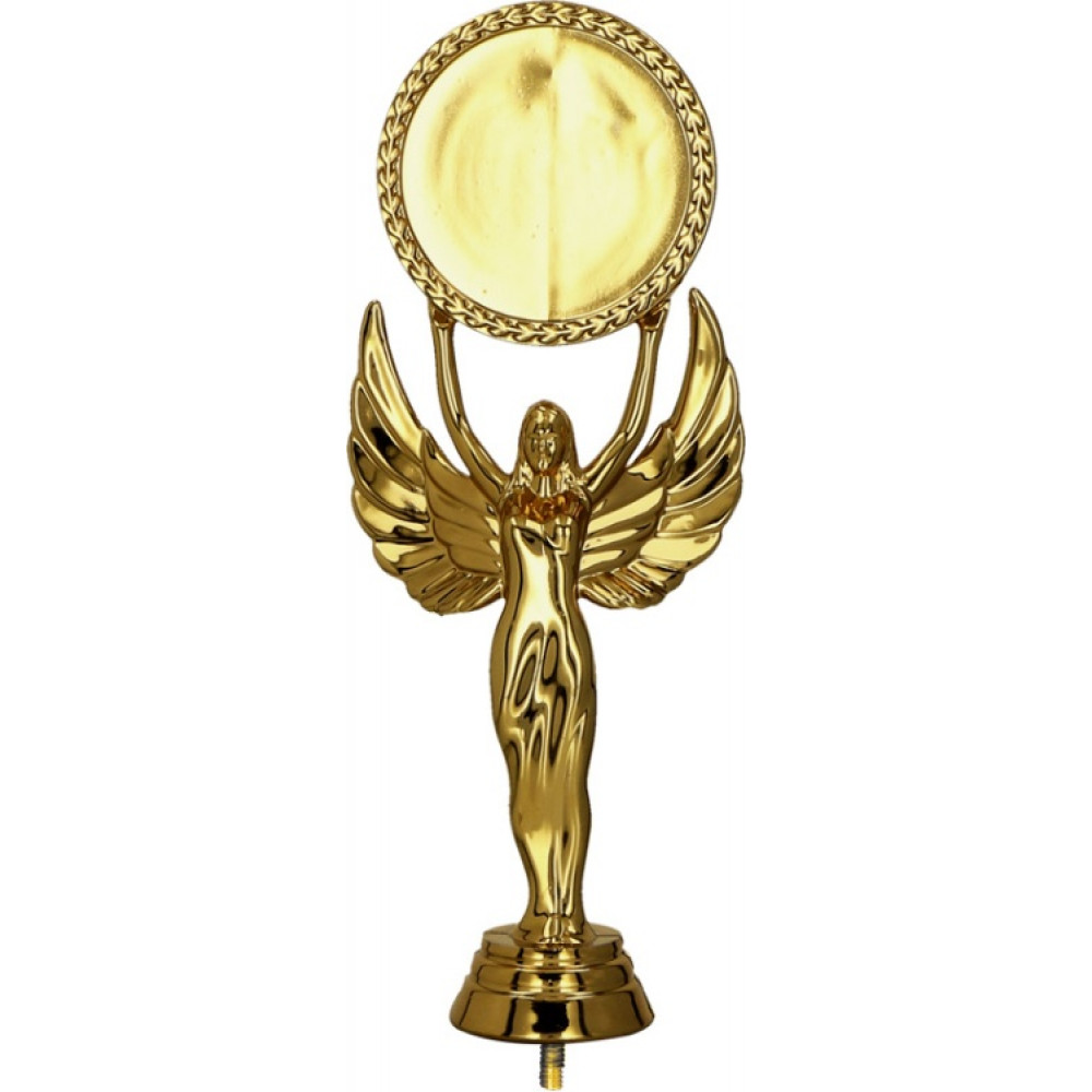 Фигурка пластиковая "Ника". Представлена в трех цветах: золото, серебро, бронза. Фигурка представляет из себя женщину с поднятыми вверх руками. Женщина имеет четкие очертания талии и груди. Руки немного согнуты в локтях, будто расслаблены. В руках держит эмблемоноситель (для персонализации) в форме круга с окантовкой в виде переплетенных тонких полос. Волосы до плеч, распущены. Одета в длинное платье с коротким рукавом, платье свободно струится по телу, из под платья видны кончики пальцев на ногах. За спиной у женщины расположены крылья. Высота крыльев схожа с высотой поднятых вверх рук. Концы крыльев заостренные. Женщина имеет славянские черты лица. Фигура установлена на небольшой подставке круглой формы. Фигурку возможно закрепить на цоколь, постамент или кубок.