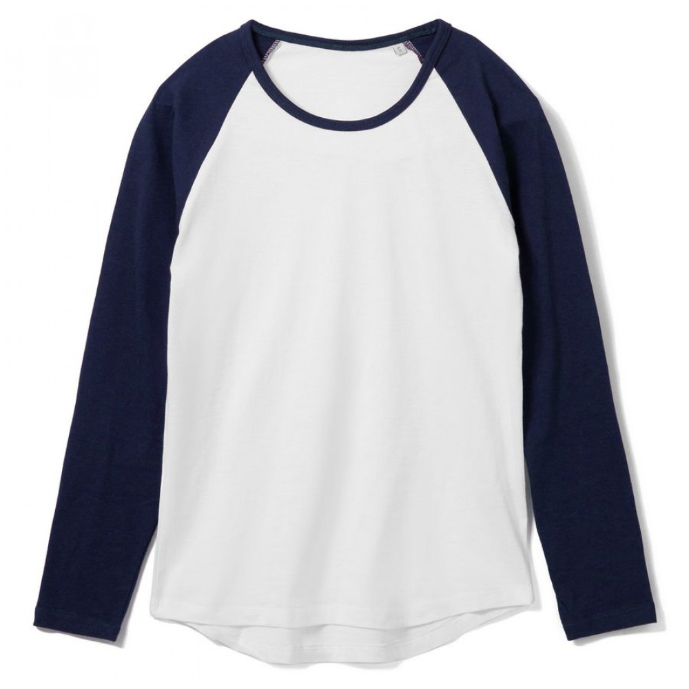 Женская двухцветная футболка с боковыми швами, длинным рукавом реглан и закругленным низом.