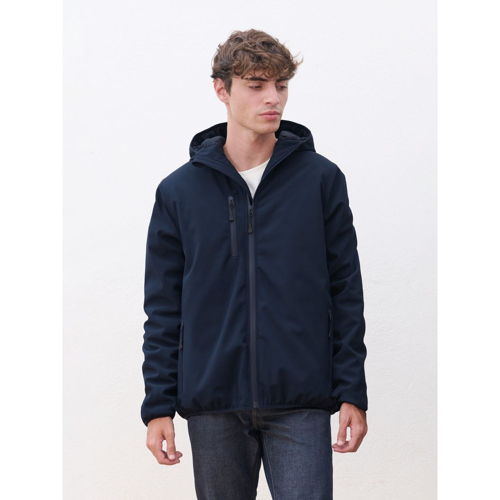Мужская куртка софтшелл на молнии и с капюшоном.