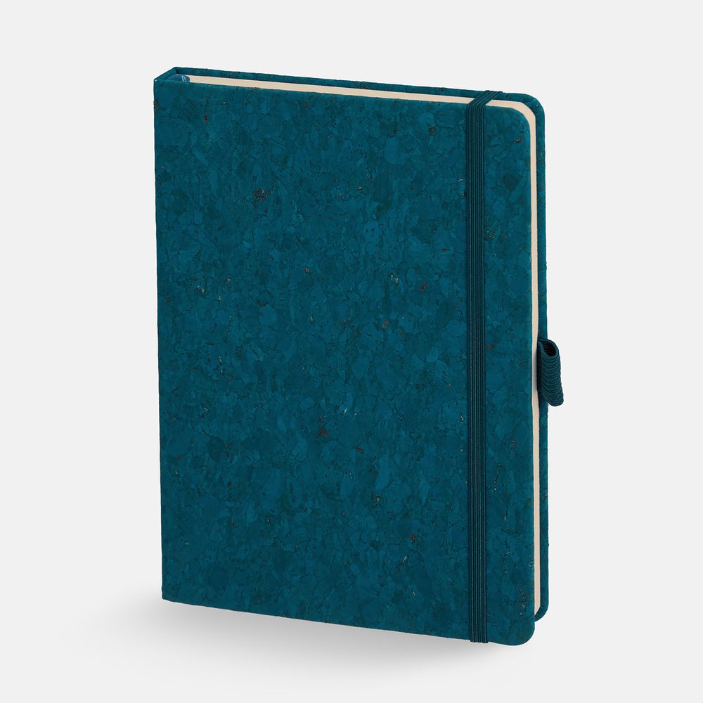 Блокнот с твердой обложкой из натуральной окрашенной пробки, дополнен петлей-резинкой для ручки, ляссе и резинкой в цвет обложки.