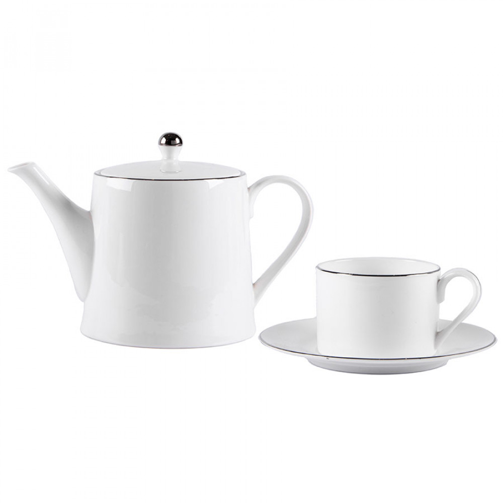 Чайный набор состоит из чайника и чайной пары, декорированы серебряным кантом. Все предметы изготовлены из костяного фарфора. Это разновидность материала, в котором, помимо основных компонентов, содержится примесь обожженной костяной муки. Такая посуда обладает тонкими стенками и значительно легче, чем аналогичные модели, но не уступает им по прочности. Весь набор отличается элегантной фактурой и идеально белым цветом.