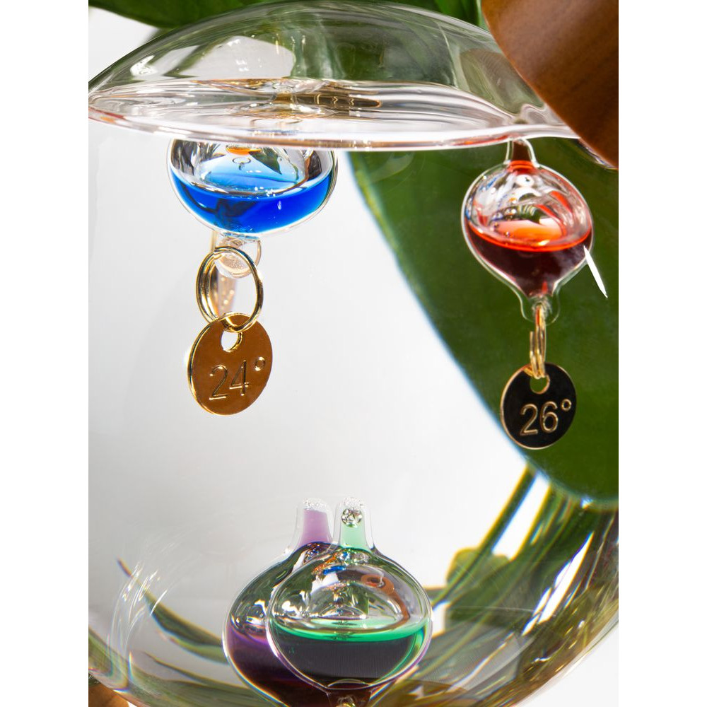 Термометр Галилео оригинальной формы, напоминающей глобус, добавит индивидуальности домашнему или офисному интерьеру. В основе его работы лежит физическая закономерность, впервые отмеченная великим Галилео Галилеем: плотность жидкости увеличивается при снижении температуры и уменьшается при ее повышении. И теперь стеклянные шарики в жидком парафине не только радуют глаз, но и позволяют с легкостью определить температуру в помещении.