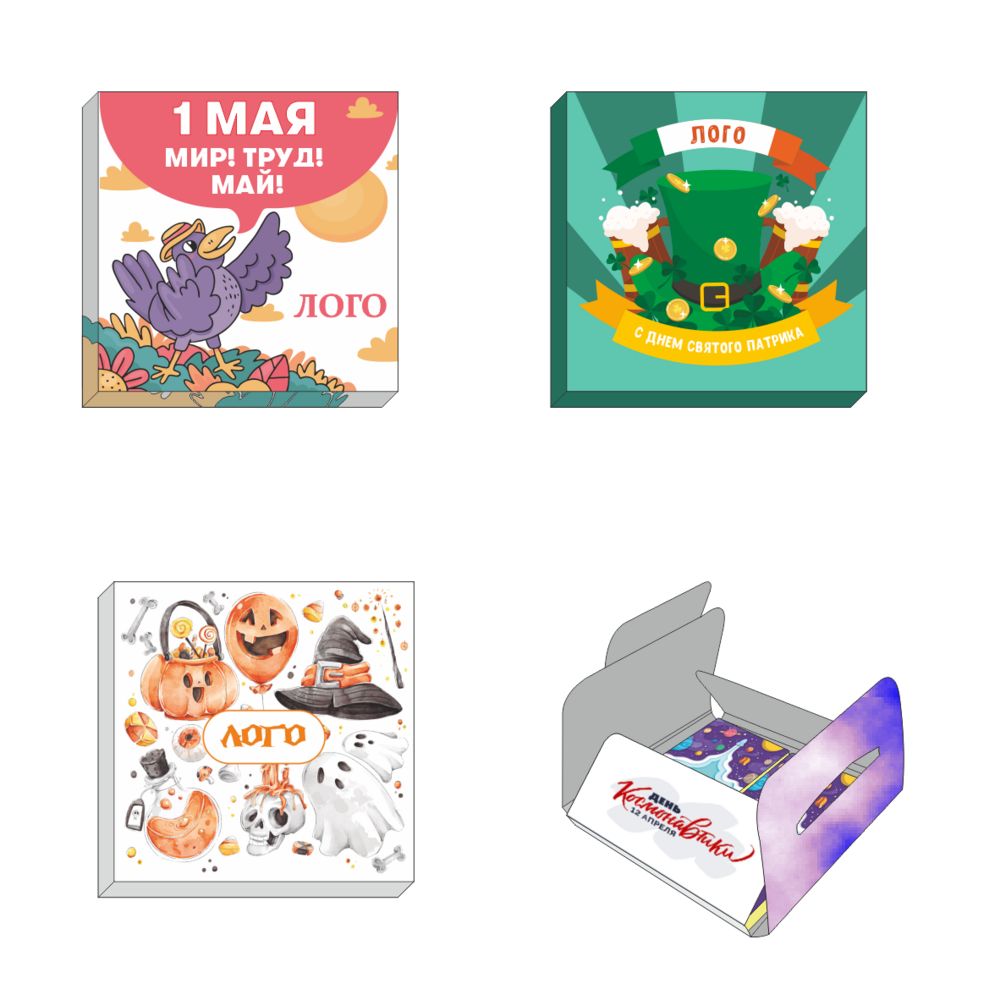 • Обертка с полноцветной печатью на каждой плитке шоколада.