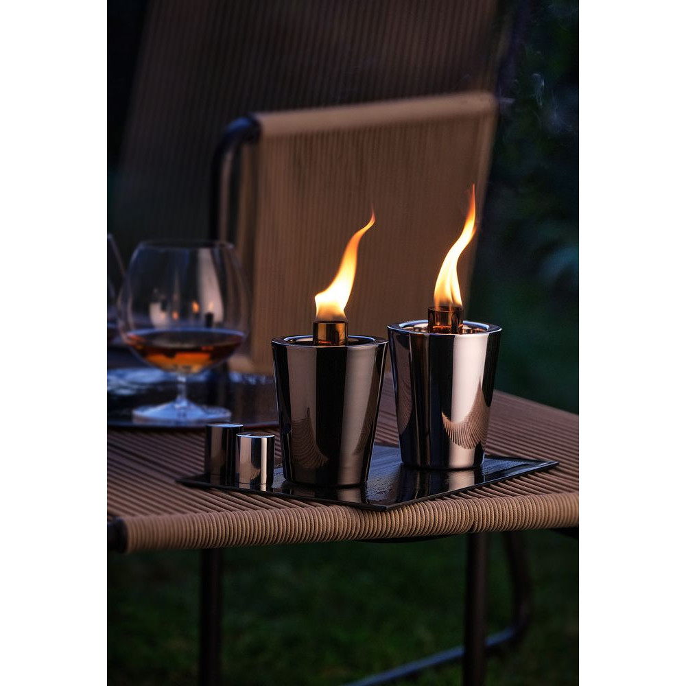 Уличный светильник Tarcia согреет прохладными вечерами и поможет создать уютную атмосферу на балконе или террасе. Емкость резервуара для топлива обеспечивает примерно четыре часа горения. Чтобы погасить пламя, достаточно надеть входящий в комплект колпачок. В качестве топлива можно использовать лампадное масло без запаха и добавок, а также некоторые виды биотоплива.