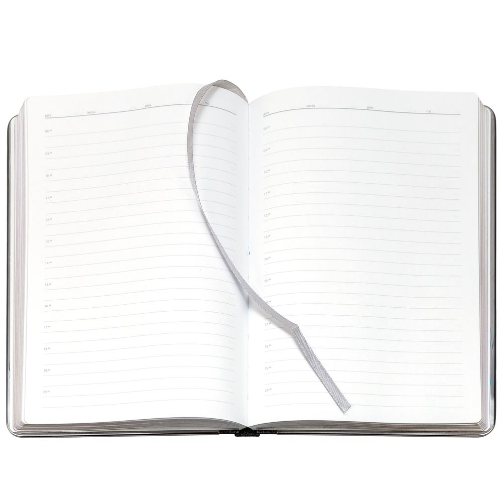 Ежедневник с твердой обложкой и серебристым обрезом, выполнен из материала Saffian, черный, дополнен серым ляссе и металлическими рамками.
