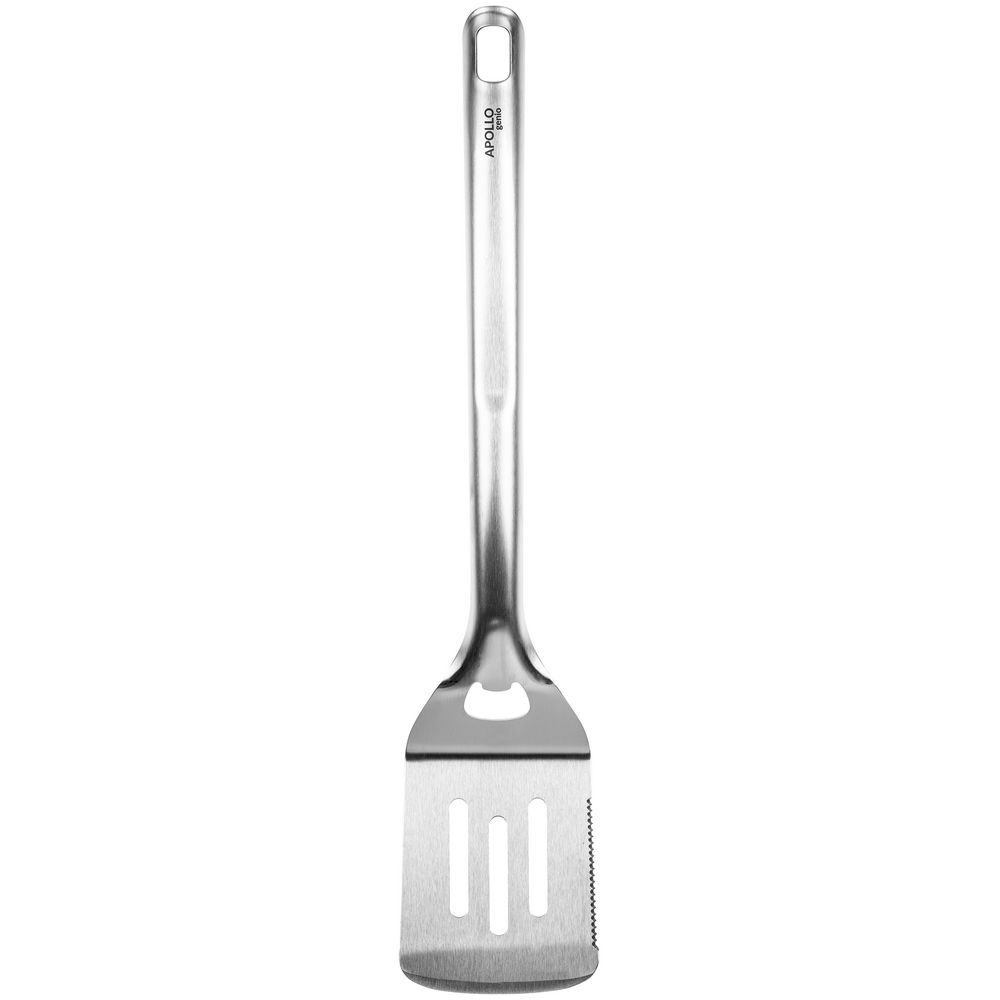 Лопатка Grillo предназначена для переворачивания продуктов на гриле, мангале или жаровне. Прорези позволяют стекать излишкам масла, соуса или жидкостей. Зубчатый край поможет разрезать большие куски при подаче, а встроенная открывашка — не остаться без прохладительного напитка. Имеет оптимальную для безопасного использования длину и отверстие, позволяющее удобно подвесить прибор на крючок.