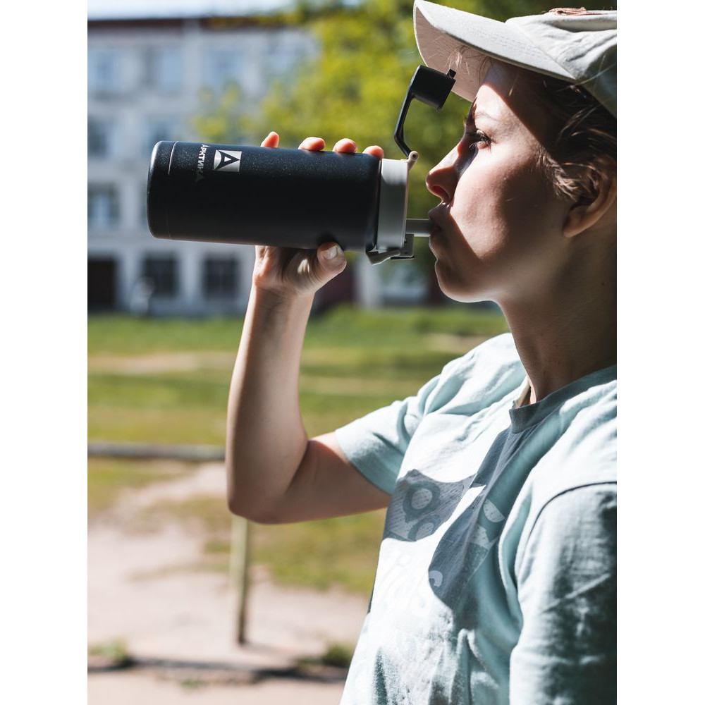 - Благодаря питьевой системе с носиком-поильником термостакан легко открыть, нажав на кнопку, и пить во время движения