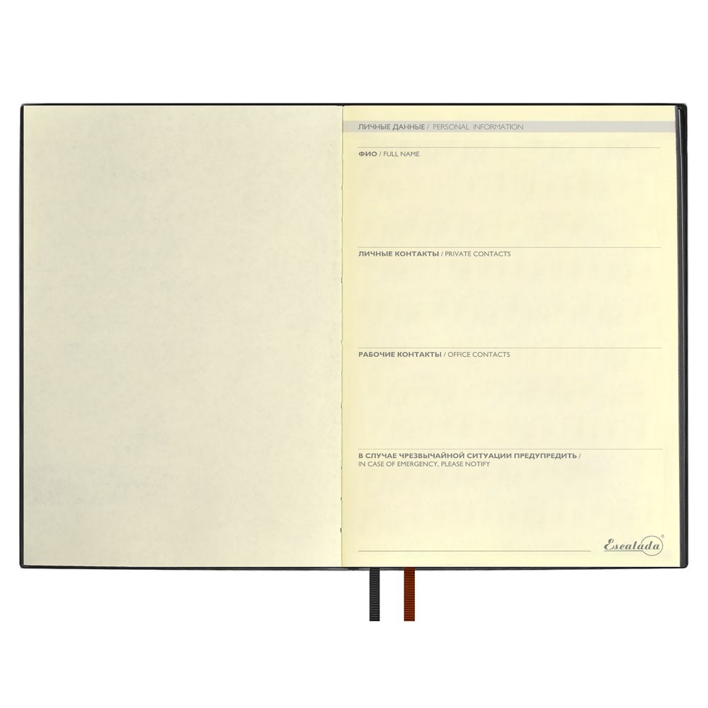 Ежедневник с гибкой обложкой и закладкой из искусственной кожи, дополнен капталом и двойным ляссе.