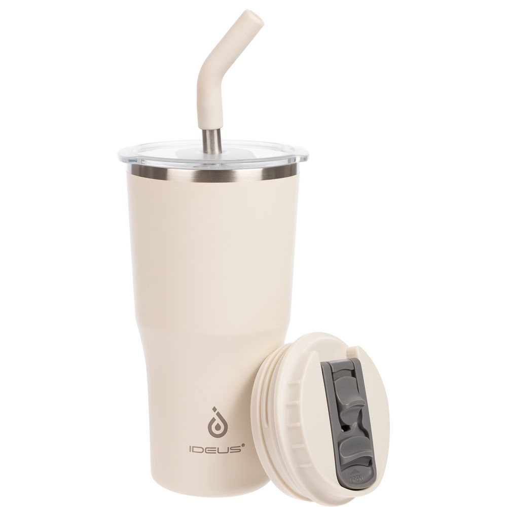 - 2 крышки в комплекте: одна на 100% герметичная с механизмом блокировки отверстия для питья, вторая — с отверстием для трубочки