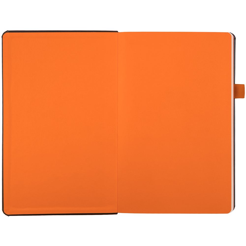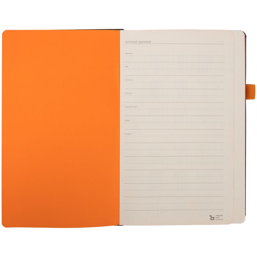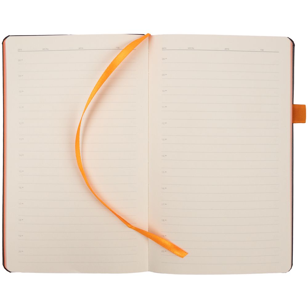 Ежедневник с твердой обложкой, выполнен из материала Waltz, черный АА, дополнен оранжевой резинкой и ляссе.