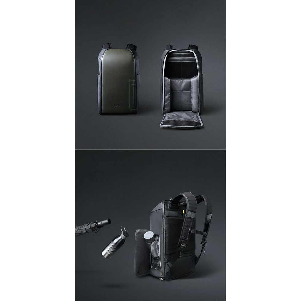 - 2 боковых кармана с быстрым доступом благодаря клапанам на сильных магнитах: один карман с дополнительной специальной водозащитой для термокружки, бутылки с водой или зонта, второй карман для мелкой электроники с дополнительной регулируемой мягкой перегородкой на липучке