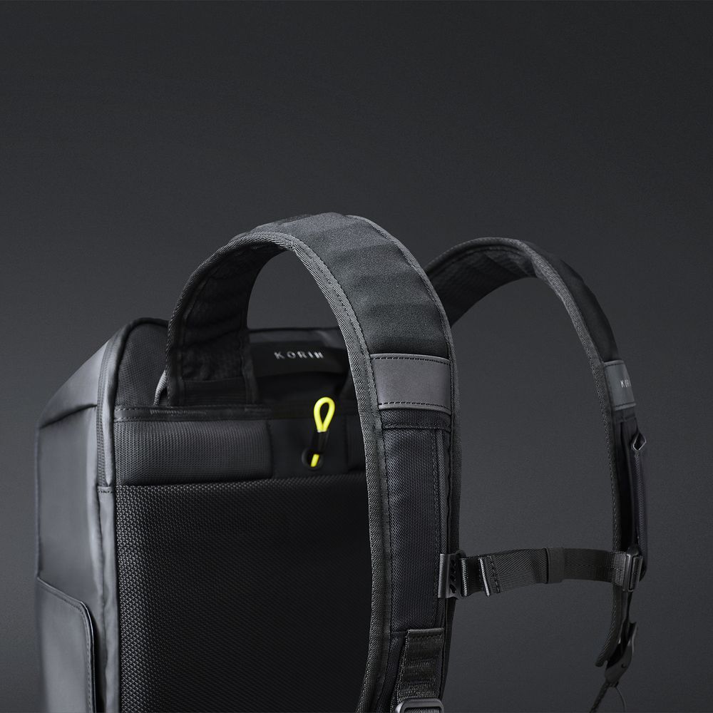 - Анатомическая конструкция рюкзака вместе с широкими лямками и поперечным ремнем на магнитной пряжке перераспределяют часть нагрузки с плеч и спины на талию и бедра, в результате чего вес рюкзака воспринимается на 20-25% легче, чем при использовании стандартных моделей