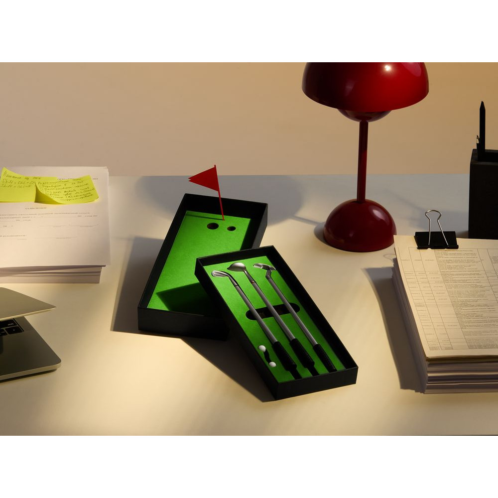 В комплект входят 3 клюшки, 2 мячика для гольфа, флажок и подарочная коробка, крышка которой служит полем для гольфа. Цель игры — забить мяч в лунку, используя специальные клюшки. Игроки по очереди делают удары, стараясь попасть в цель. Чем меньше ударов потребуется, тем больше очков зарабатывает участник.