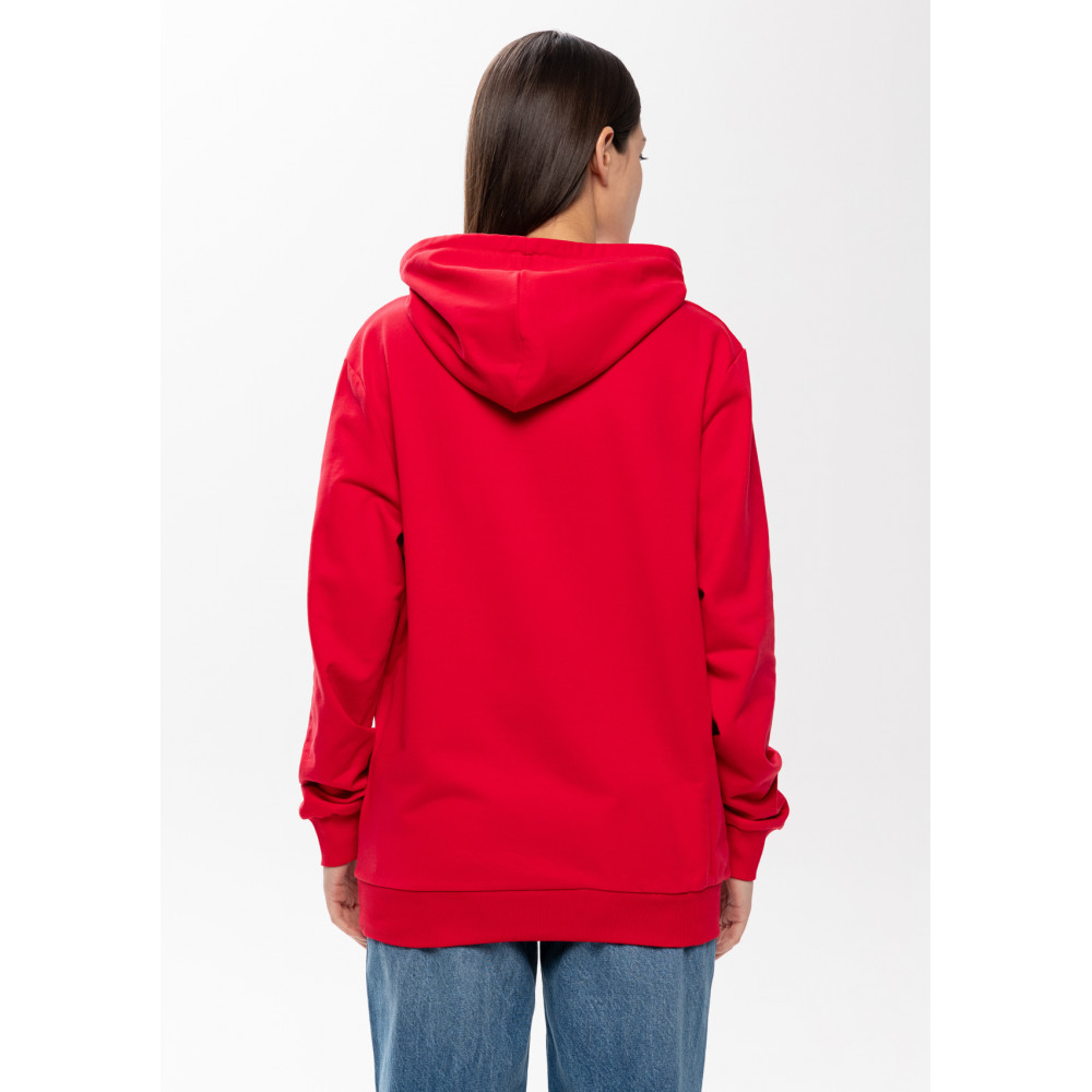 Толстовка прямого силуэта с капюшоном, втачным рукавом и карманом-кенгуру. Капюшон дополнен шнурком для регулирования прилегания, манжет и низ изделия оформлены широкой эластичной резинкой. Возможно два варианта исполнения: контрастные шнурок и бейка/шнурок и бейка в цвет толстовки.