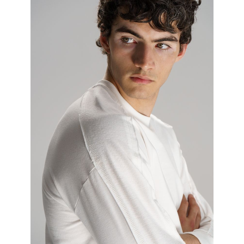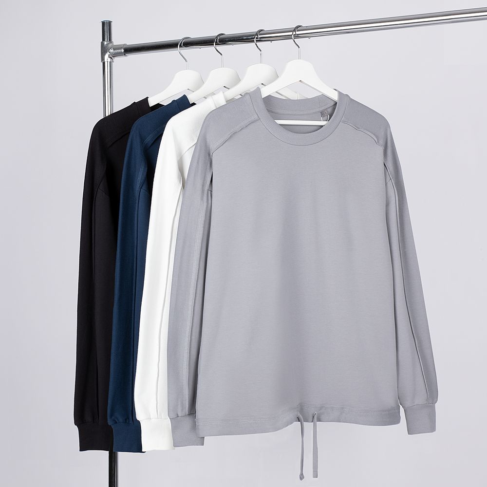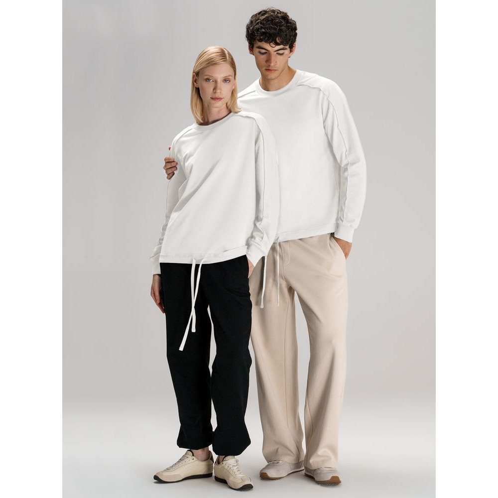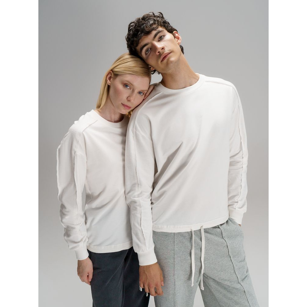 Свитшот унисекс оригинального пошива вдохнет новую жизнь в повседневный гардероб и добавит стильную нотку легкой небрежности в образ. Особая конструкция, где часть деталей — плечи и рукава — вывернута наизнанку, создает необычный притягательный эффект.