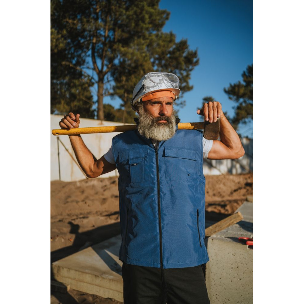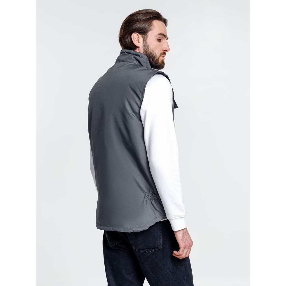 Мужской утепленный жилет с воротником-стойкой и удлиненной спинкой. Выполнен из ткани оксфорд с водоотталкивающим покрытием.