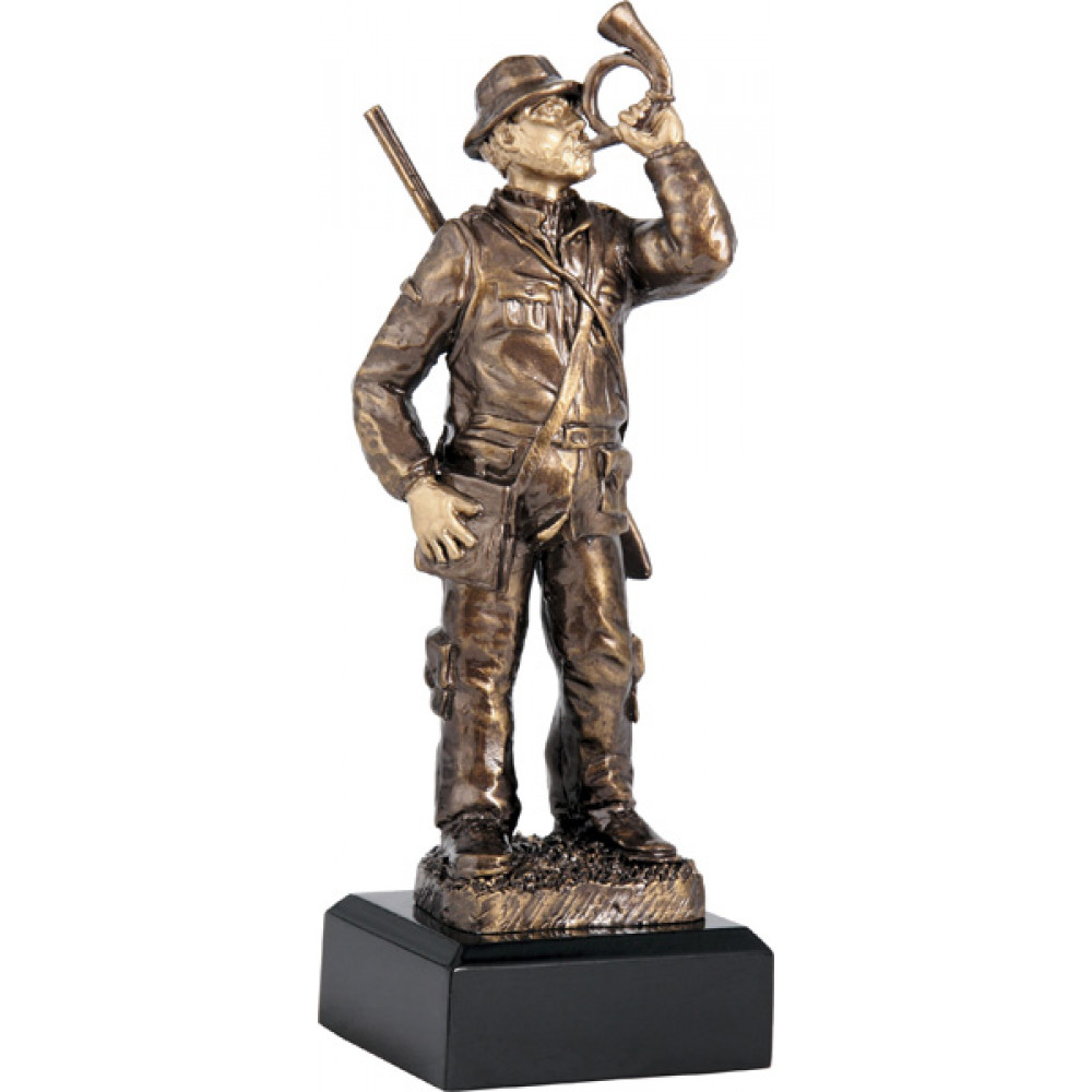 Фигурка литая "Охотник". Цвет бронза. Материал: пластик. высота 23 см. Изображен охотник, который дует в горн. Охотник изображен в специальном костюме, на голове панама, через плечо одета сумка. За спиной висит ружье. Фигурка установлена на цоколе квадратной формы, цвет черный.