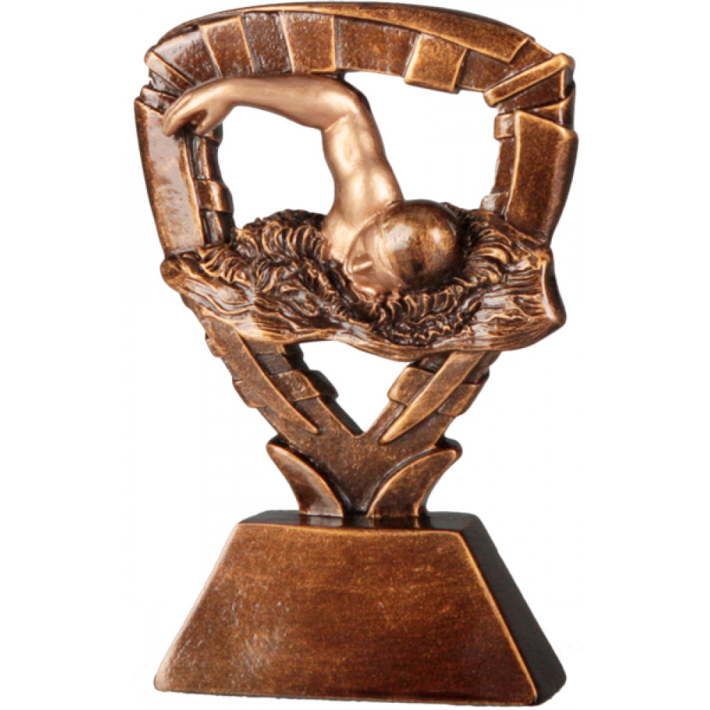 Фигурка литая "Плавание". Материал пластик, цвет бронза. Высота 13 см.¶Фигурка представляет собой треугольник с широким кантом, на котором расположены четырехугольные выпуклые фигуры по периметру. В центре треугольника расположена фигура пловца. Спортсмен плывет кролем. Правая рука спортсмена поднята над водой, голова повернута в сторону руки. Фигура имеет основание в форме трапеции. Место под эмблему размером 40*25 мм.