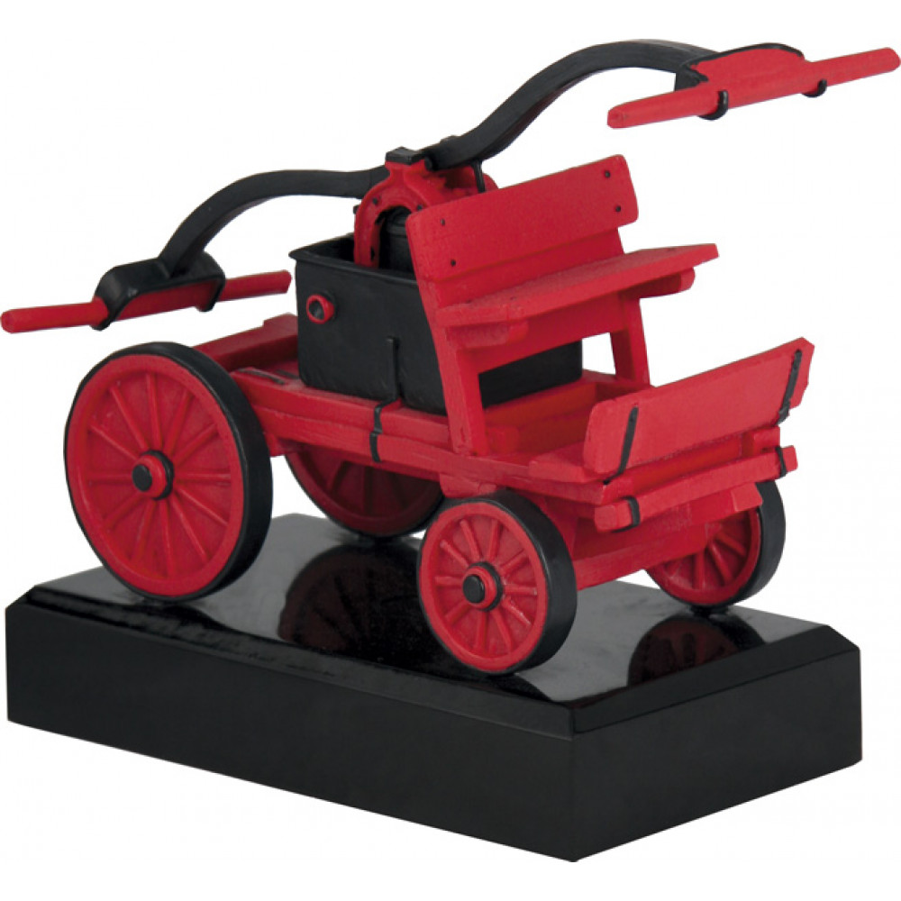 Фигурка литая "Пожарный". Цвет - красный с черным. Высота 15,5 см. Изображена пожарная тележка. Тележка установлена на цоколе прямоугольной формы, цвет черный.
